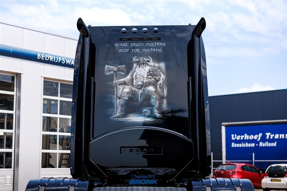 Het bedrijf zocht iets spectaculairs voor de vloot en kwam hierbij in Nederland uit. Truckspuiterij Bronk, Van Kessel Truckstyling, Kim Mae Airbrush en Pennings Interieurs mochten aan de slag met een stoere Volvo FH16 XXL. Het resultaat is spectaculair. De pikzwart gespoten trekker straalt pure kracht uit. Dit wordt versterkt door de enorme bullbar en de stenenvanger voor de voorruit, die in Nederland echt niet door de APK zou komen.