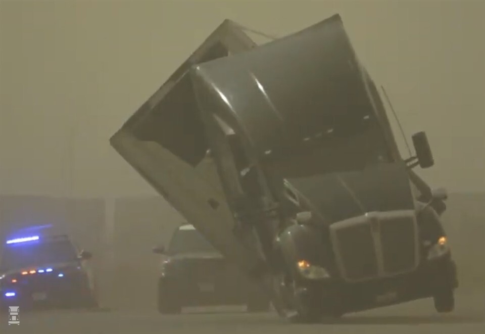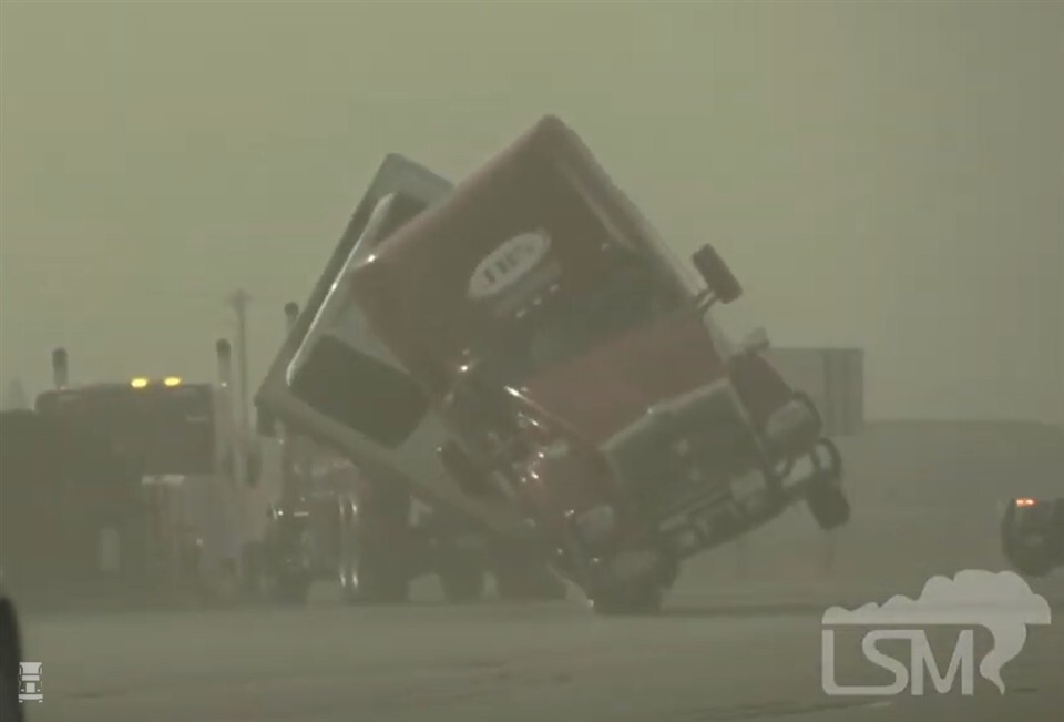 “Daar gaat er eentje”, zegt storm chaser Blake Brown verbazend rustig terwijl hij staat te filmen langs de I-40 bij Amarillo in Texas. “Daar gaat er nog één.” In zijn video, op het kanaal Live Storm Media, worden vrachtwagens omver geblazen alsof het niks is. Sommige trailers worden in zijn geheel opgetild, alvorens terug op het asfalt gekwakt te worden. Een zandstorm gecombineerd met orkaanwinden zorgden voor chaos op de snelwegen.