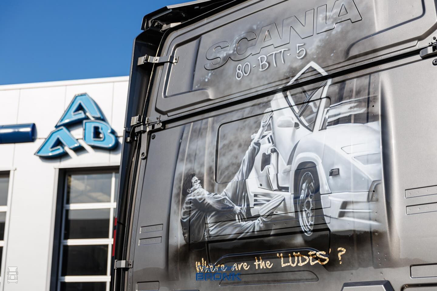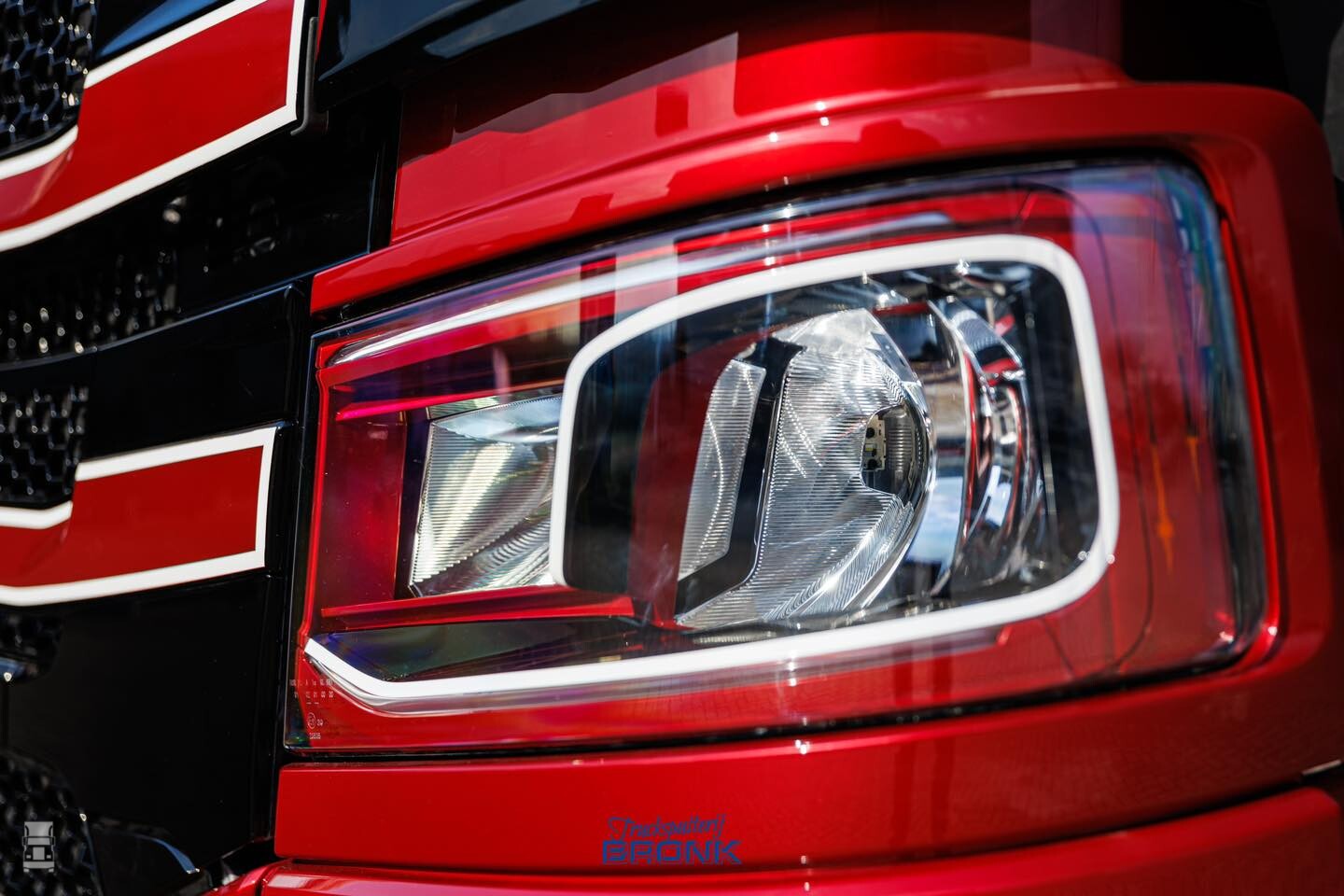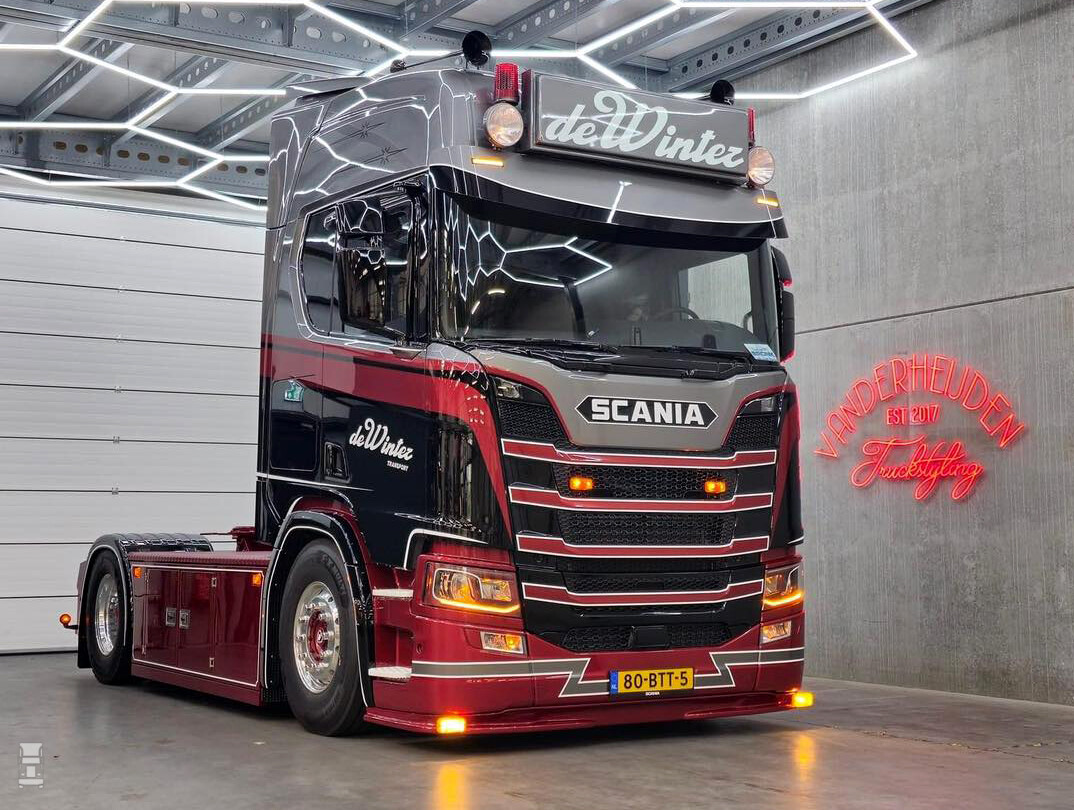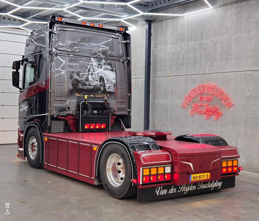 Op de foto's zie je één van de twee trucks die net uit de spuiterij komt. De auto is hier nog niet voorzien van de lichtbak en de zijskirts, maar de aandacht voor detail van het spuitwerk is prachtig. Kijk eens naar die koplampen bijvoorbeeld! De airbrush op de achterwand is van MWDesigns, de verdere opbouw vond plaats bij Van der Heijden Truckstyling.