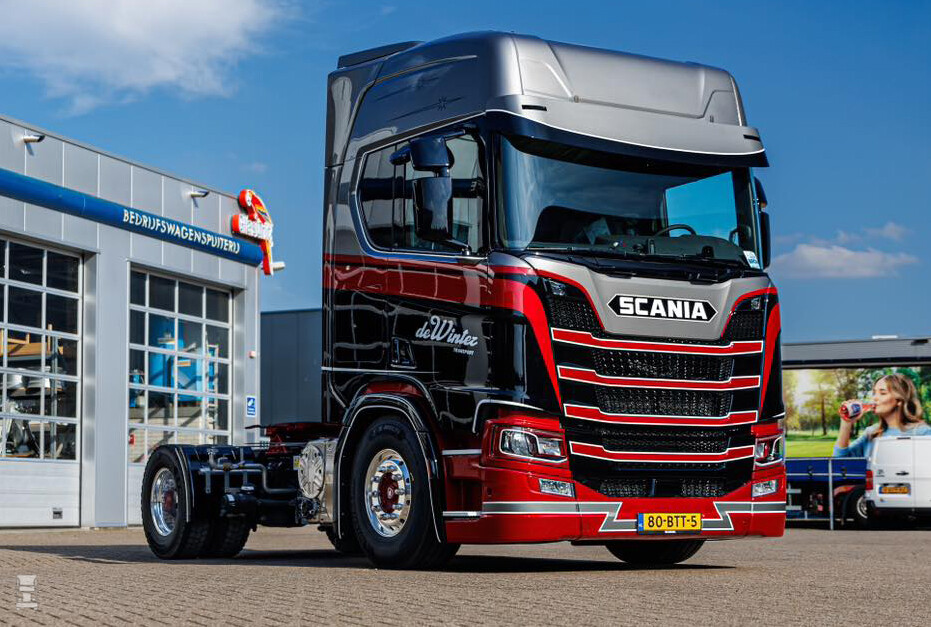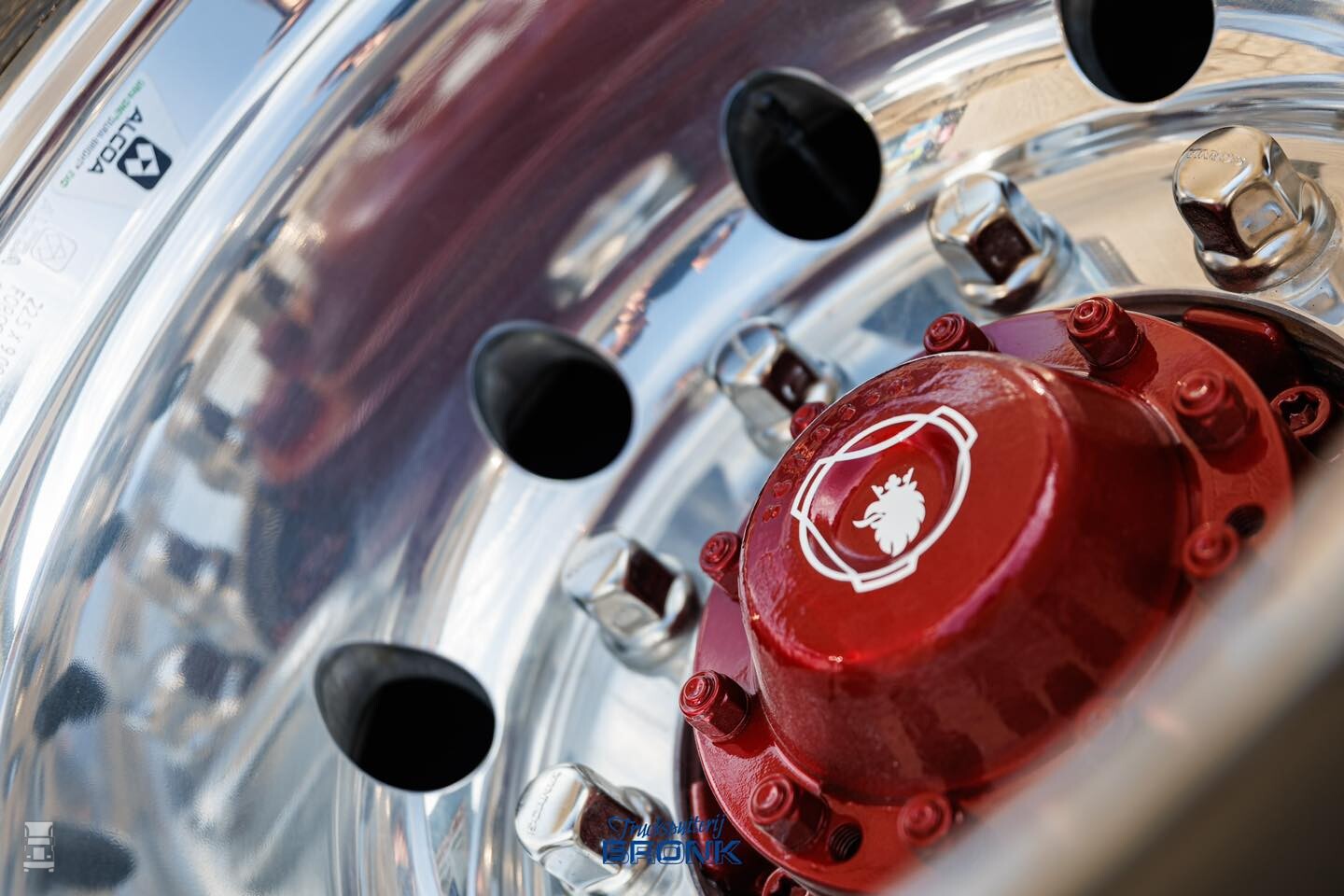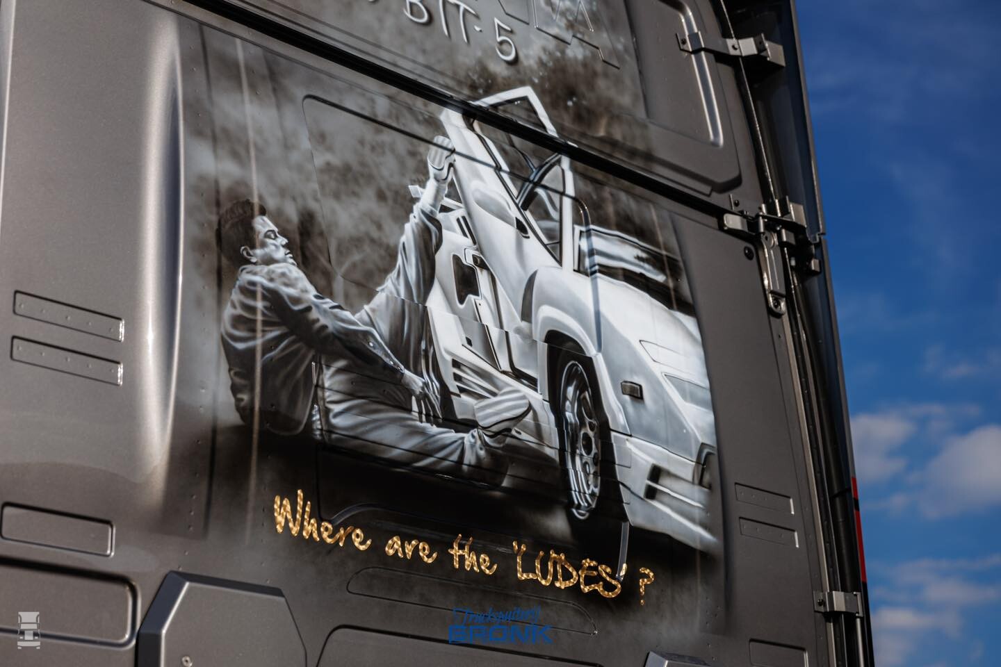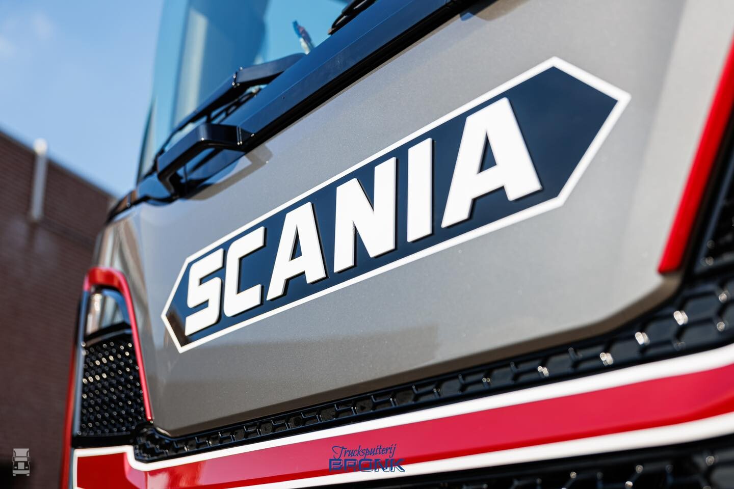 Op de foto's zie je één van de twee trucks die net uit de spuiterij komt. De auto is hier nog niet voorzien van de lichtbak en de zijskirts, maar de aandacht voor detail van het spuitwerk is prachtig. Kijk eens naar die koplampen bijvoorbeeld! De airbrush op de achterwand is van MWDesigns, de verdere opbouw vond plaats bij Van der Heijden Truckstyling.