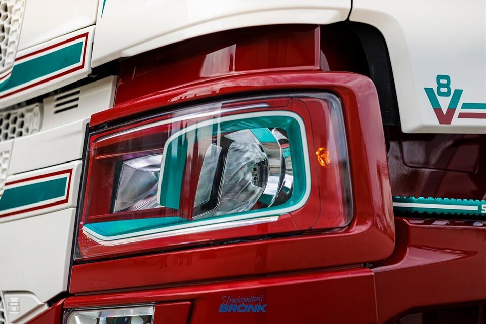 Op de foto’s is de vrachtwagen nog niet helemaal af, maar ze geven al een goede indruk van het eindresultaat. De Scania is door Truckspuiterij Bronk, aangesloten bij Barbatruck, gespoten in de mooie bedrijfskleuren. Het is een waar kunstwerkje geworden, kijk maar eens naar de details en de koplampen. Peter Evers van KimMae voorzag de achterwand van een nostalgische airbrush van een Volvo. De Scania is opgebouwd door Steve’s Place Truckstyling. Pennings Interieurs nam de binnenkant van de cabine onder handen.
