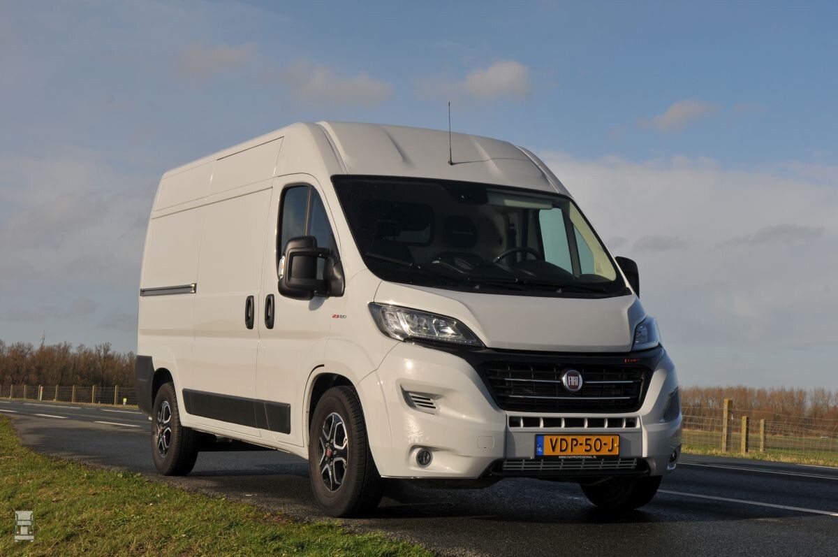 De Ducato in deze L2H2 vorm heeft een schuifdeur die breed genoeg is om een complete pallet in te laden. Aan de achterkant is dat natuurlijk al helemaal geen probleem en de wielkasten zitten een europallet niet in de weg. Fijn is de verlichting in de laadruimte, die professioneel is afgetimmerd. Meest opvallend aan het rijden met de Ducato is de kracht van 2,3 liter motor, die in de 180 pk en 400 Nm uitvoering natuurlijk overbemeten is voor zijn werk, dat bestaat uit het vervoeren van ladingen van maximaal 1210 kg. We zouden deze motor wellicht adviseren wanneer er naast de lading in de Ducato, ook nog een aanhanger getrokken zou moeten worden. Om aan Euro 6 D te voldoen, is de jongste versie van de 2,3 liter motor voorzien van een SCR-systeem, wat een AdBlue tank betekent. Die meet 19 liter en dat is netjes.