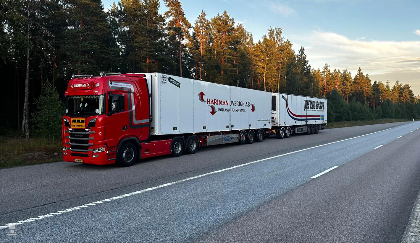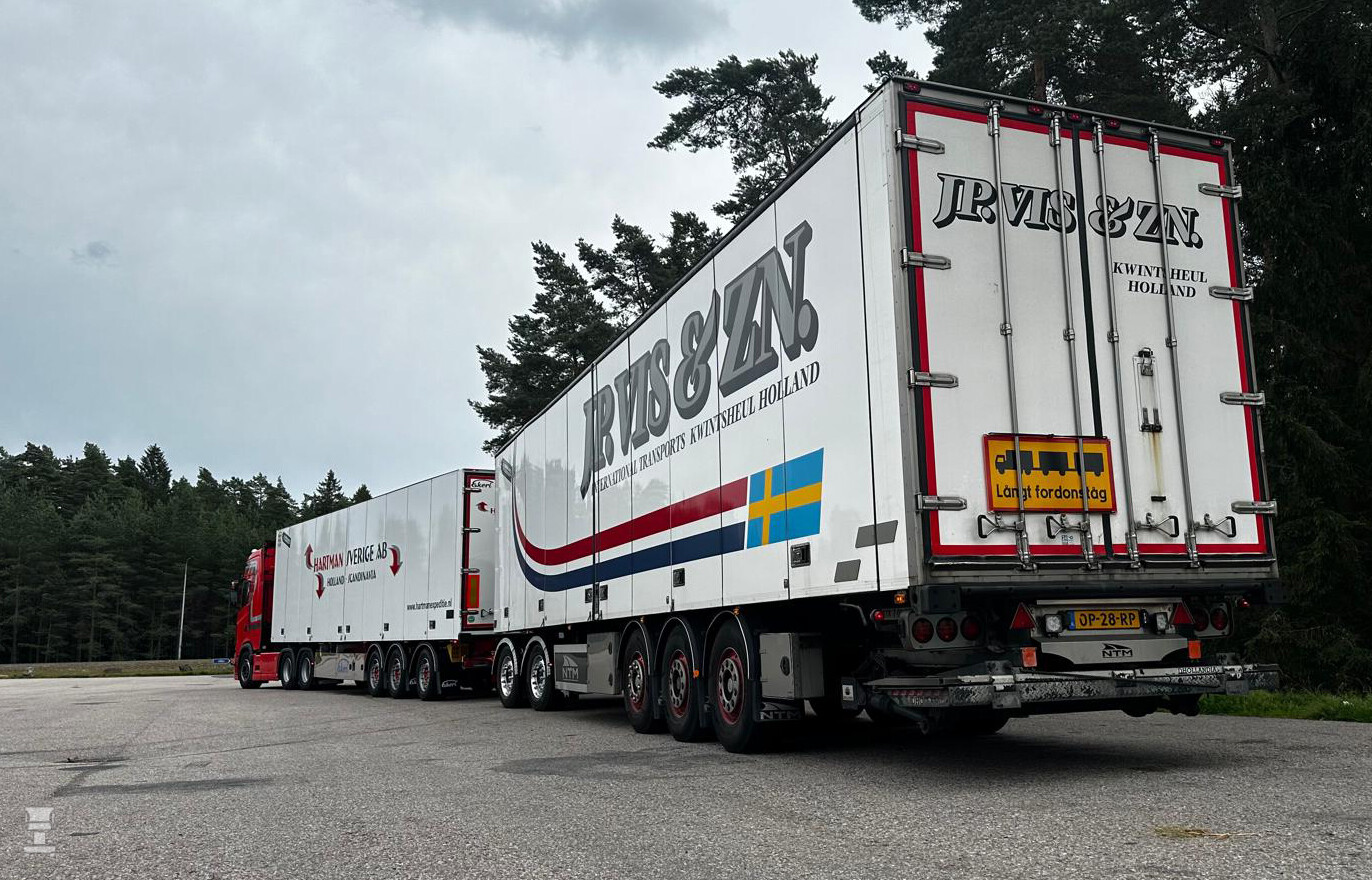 Hartman Expeditie en zusterbedrijf J.P. Vis & Zn. zet de 74 ton zware, 34,5 meter lange combinaties in tussen de ferry in Malmö en bestemmingen in midden en noord Zweden. Reden voor de keuze van de 6x4 trekkers is dat daarmee tot 74 ton vervoerd mag worden in Zweden. Overigens rijden er Zweedse chauffeurs op de trucks voor Hartman Sverige AB. Lees meer op Trailertotaal.nl!