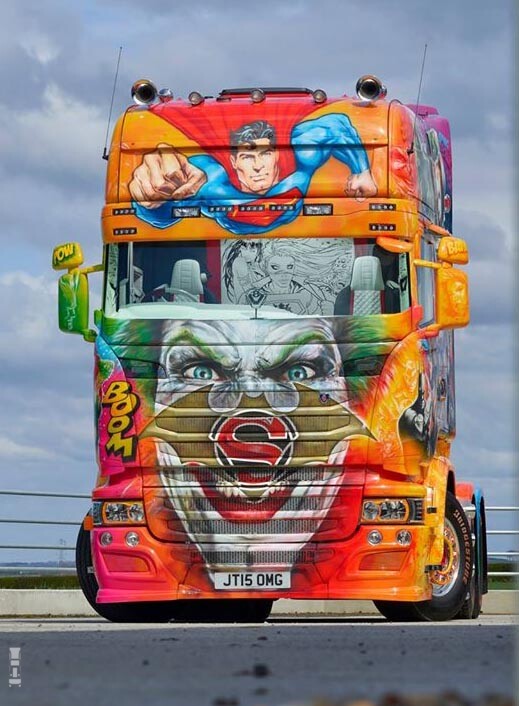 Het is de Superheroes Scania van John Templeton. De truck werd gespoten door 'Matt the Airbrusher' met een onvoorstelbaar oog voor detail. Werkelijk ieder detail is volgezet met de meest spannende, ontroerende en te gekke scenes uit cartoons waarbij zo'n beetje alle superhelden voorbij komen. Een hoofdrol lijkt weggelegd voor Superman die vanaf de voorkant van de cabine komt aanvliegen.