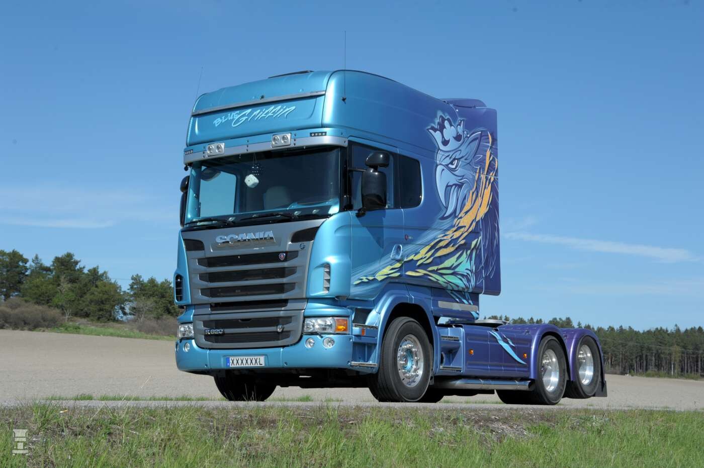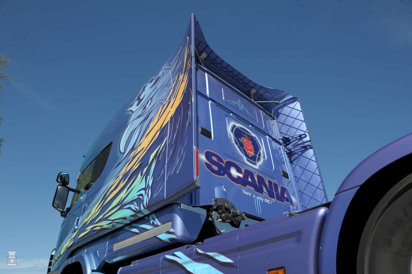 De metallic blauwe Scania is voorzien van een fraai ontworpen kleuren en lijnenspel met een agressief kijkende griffioen op de zijkanten. De truck stamt uit 2005 maar de kleurstellingen zien er nog steeds bijzonder actueel uit. Verder valt op dat Svempas zich erg ingehouden heeft met accessoires. Afgezien van twee aparte lampen in de zonneklep en een dikke sidepipe is de truck vrijwel standaard, en dat heeft wel wat.