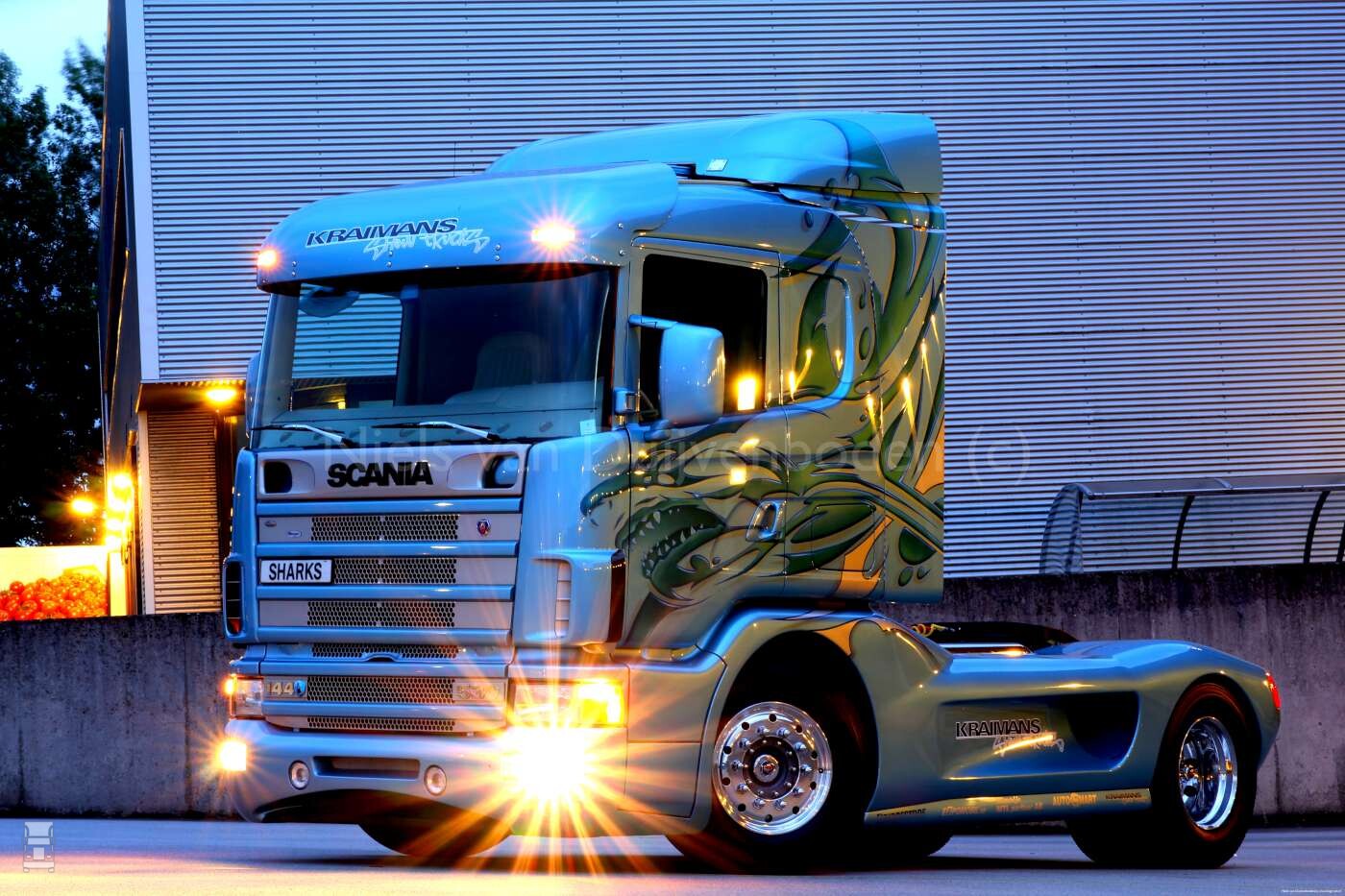Het alom bekende Scania 4 serie dashboard is cremé gespoten en de bedden zijn vervangen door een soort kast met daarin een Blauwpunkt audio en videosysteem. Alles toont een beetje gedateerd in deze digitale wereld maar alles werkt nog wel top! Ook liggen er een paar foto`s in van de opbouw van deze Shark. We zien de alom bekende gele demokleur van toen en Mike vertelt ons dat deze 530 een testauto is geweest. De cabine en het kenteken stammen daardoor uit 1994. De hele onderlijn is met de hand gemaakt en daarna gespoten. In eerste instantie was de Shark donkerpaars met een blauwe haai. Later is deze overgespoten in een lichtblauwe kleur en een groot aantal lagen blanke lak. De achterzijde is afgewerkt met een vlakke plaat waar een schitterende specialpaint op staat en langs het chassis lopen 2 uitlaten naar achteren om in de achterbumper uit te komen. De originele achterlichten zijn vervangen door 2 units van de toenmalige Audi A4. Nadat Svempa deze auto opgebouwd had en er een aantal truckshows mee was afgegaan heeft deze icoon nog wat jaren in het Scania museum gestaan. Daarna is deze verkocht aan Kraimans Showtrucks. Deze heeft de Shark een aantal jaren in het bezit gehad en nu staat deze vlijmscherpe auto qua lijnen en spuitwerk in Maasdijk. Deze auto gaat de privé collectie in van Sem maar is ook aankomend weekend te bewonderen in Assen.