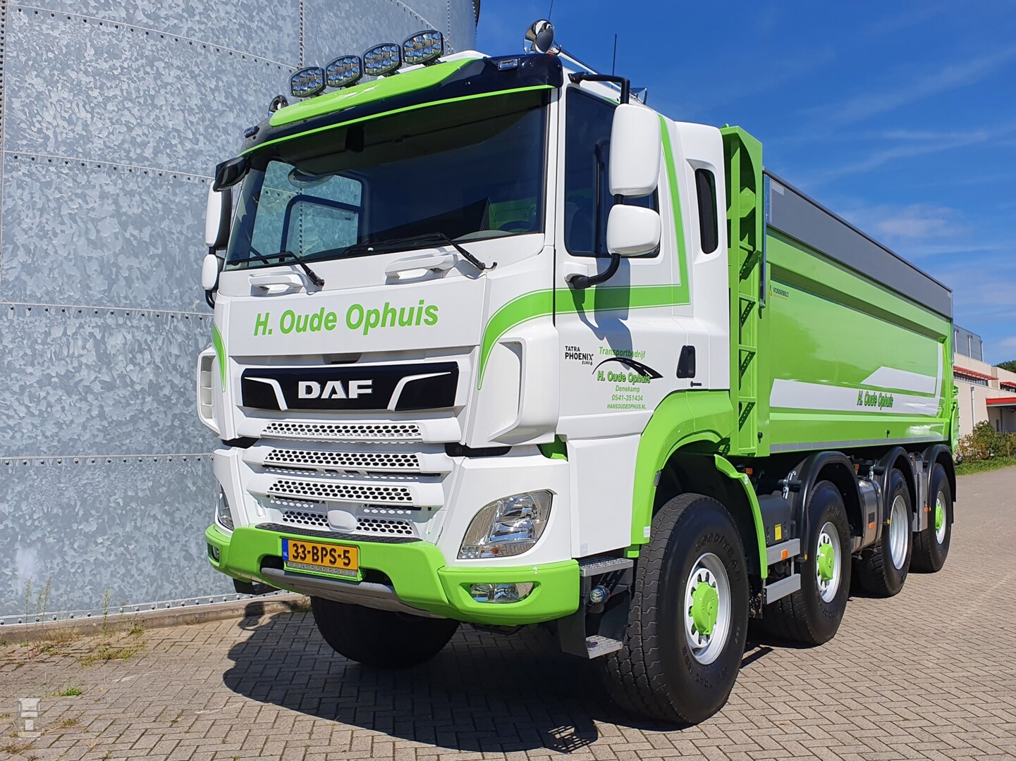 H. Oude Ophuis Transport uit Denekamp heeft een nieuwe Tatra 8x8 kipper in gebruik genomen. De dikke 46 tonner is voorzien van 530 pk en is handgeschakeld! Dat was echter nog niet bijzonder genoeg, want de Tatra grille werd vervangen door een DAF grille. Dat past beter bij de andere DAF trucks in de vloot zeg maar.