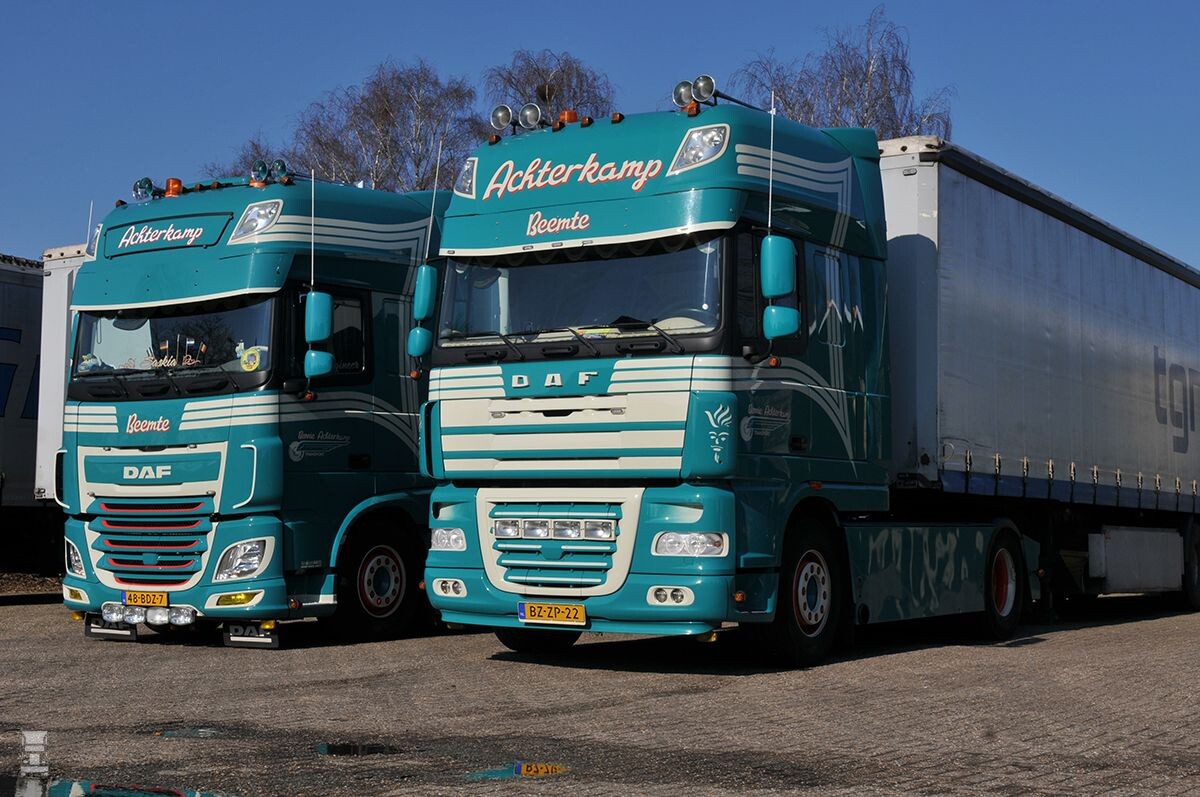 Twee jaar geleden bekeken we de opvallend gekleurde DAF's van de familie Achterkamp uit Beemte, dat aan de noordkant van Apeldoorn ligt. Klik ">hier voor de reportage die we daar toen maakten. Vader en twee zoons zetten het familiebedrijf dat in 1913 werd opgericht voort, met heel mooi gespoten DAF trucks waarmee onder andere walking floor trailers getrokken worden.