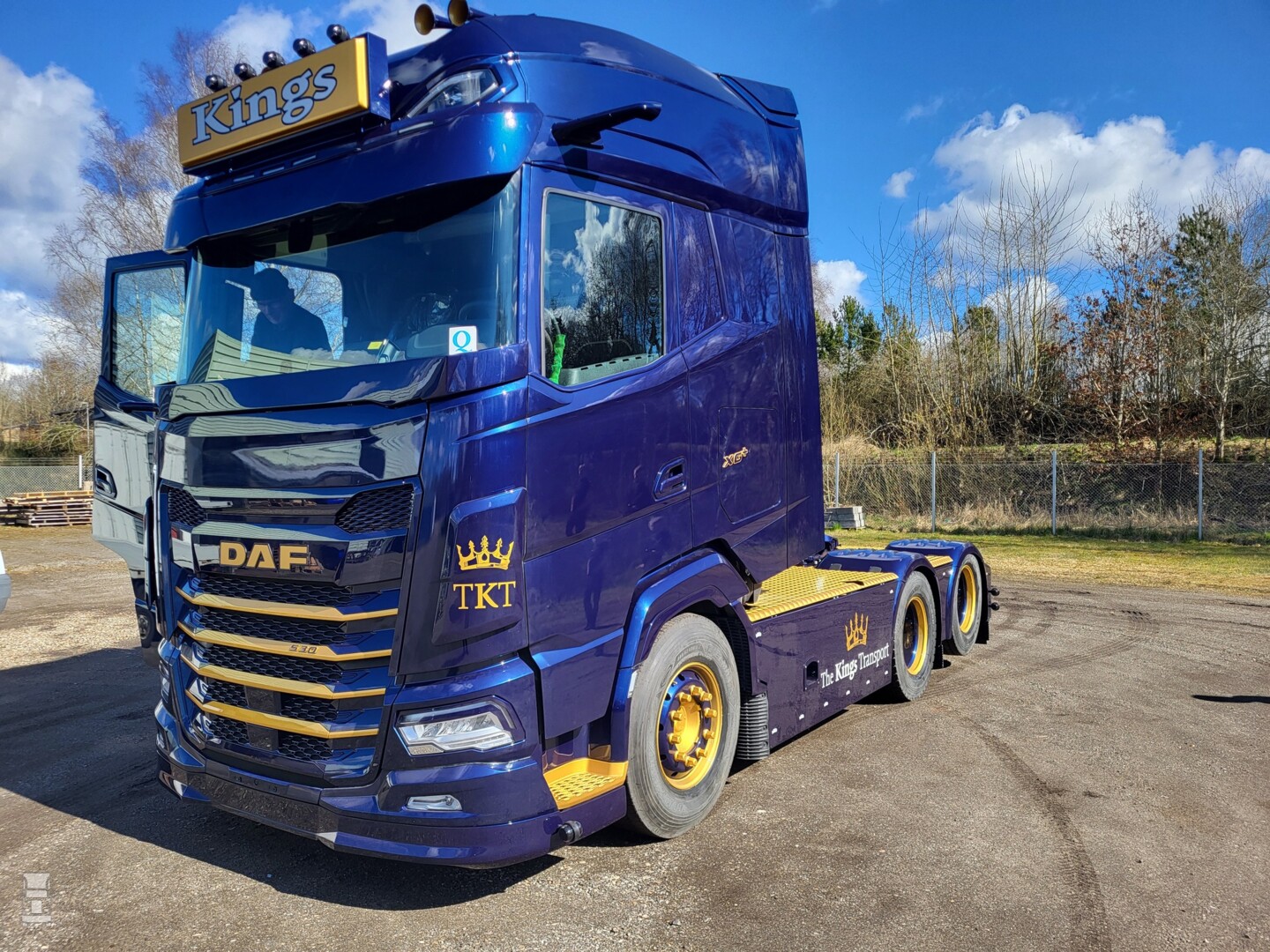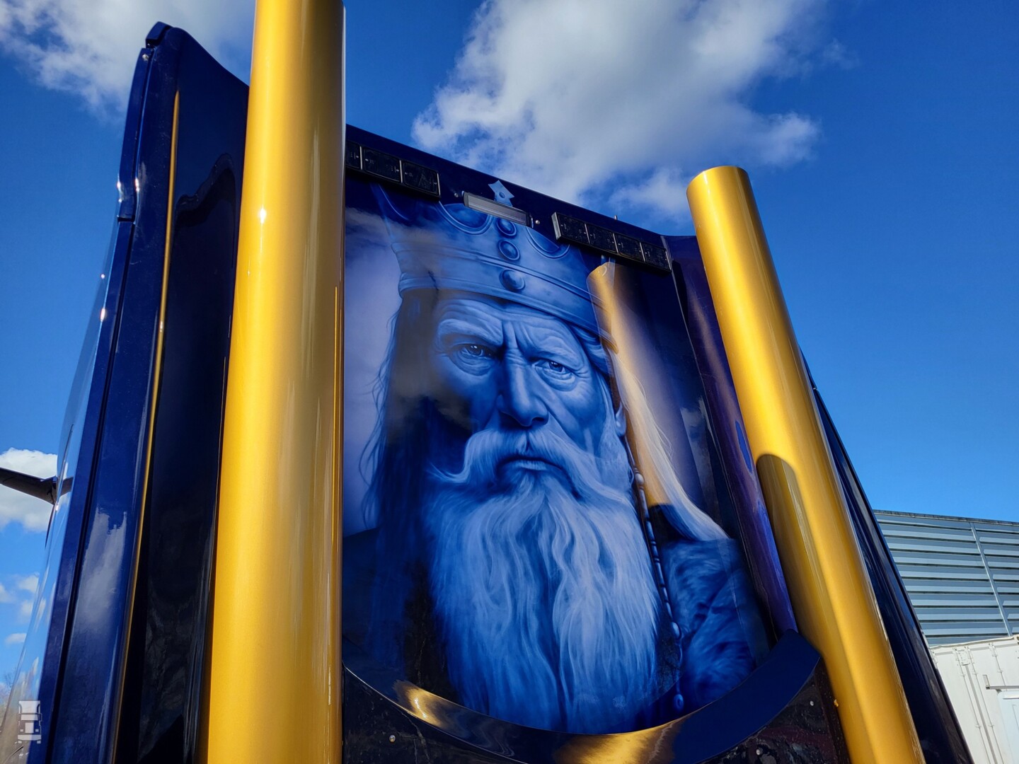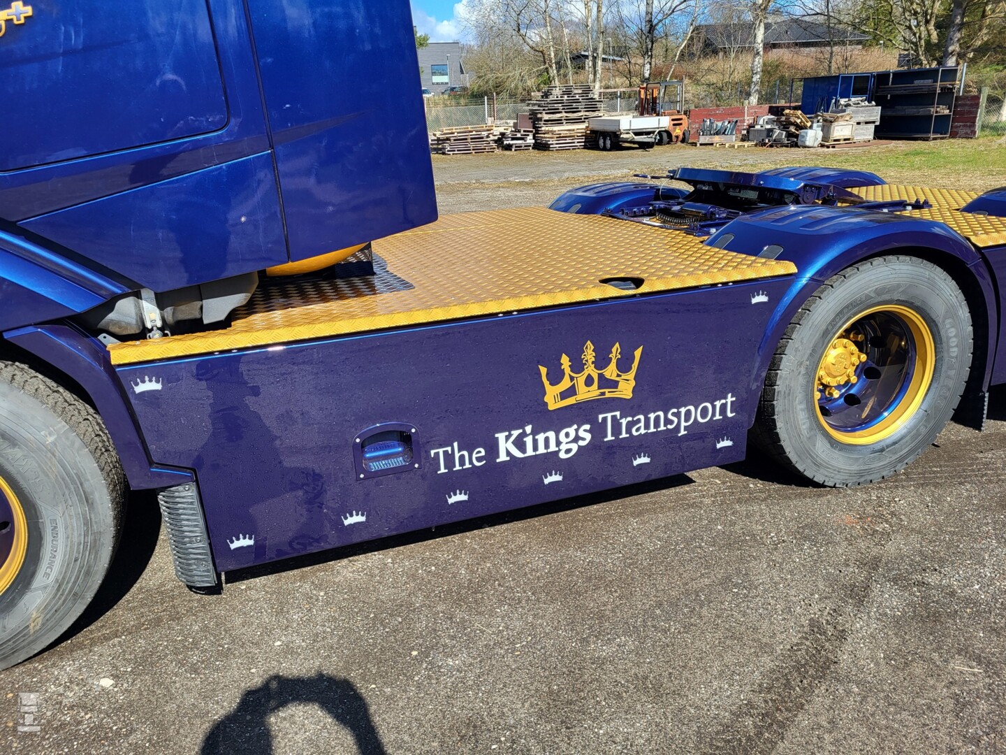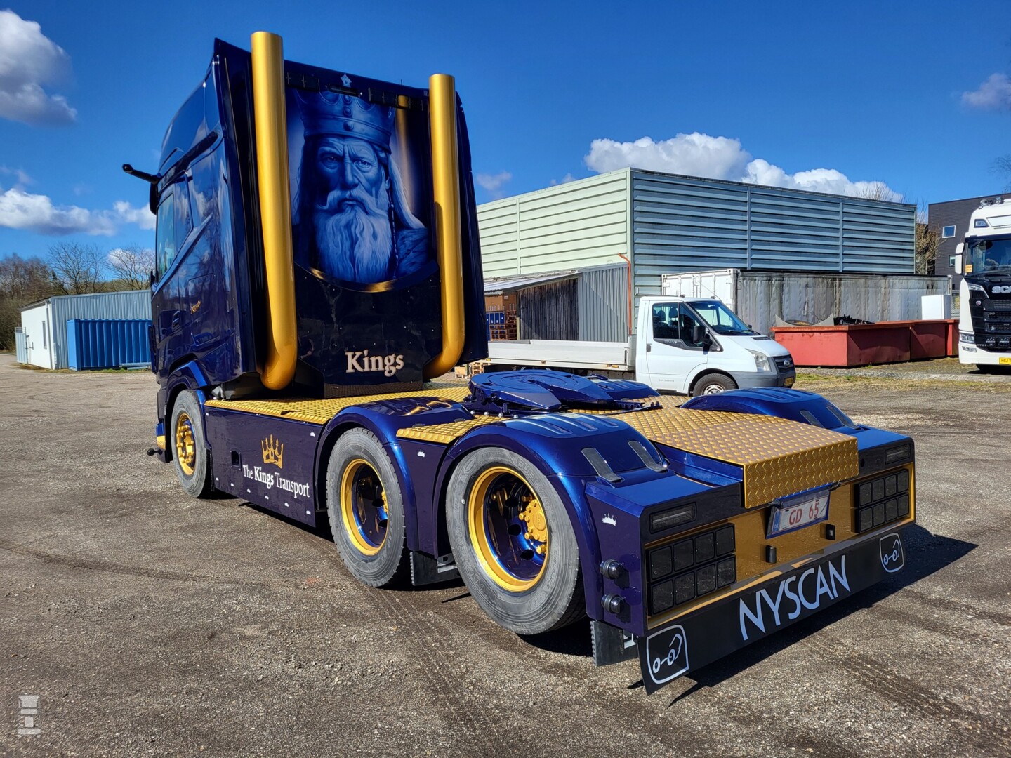 Het is opvallend hoeveel Deense vervoerders nu een keer niet kiezen voor een Zweeds, maar een Nederlands truckmerk. De DAF XG+ sleepas trekker werd voorzien van een vlonder, een speciale achterbumper met bloklampen en een dichte plaat tegen de achterwand. Daarop zien we een indrukwekkende special paint afbeelding van een man met een baard en een kroon, oftewel de King zelf. Zijn portret wordt aan weerskanten geflankeerd door goudkleurige staande uitlaatpijpen.