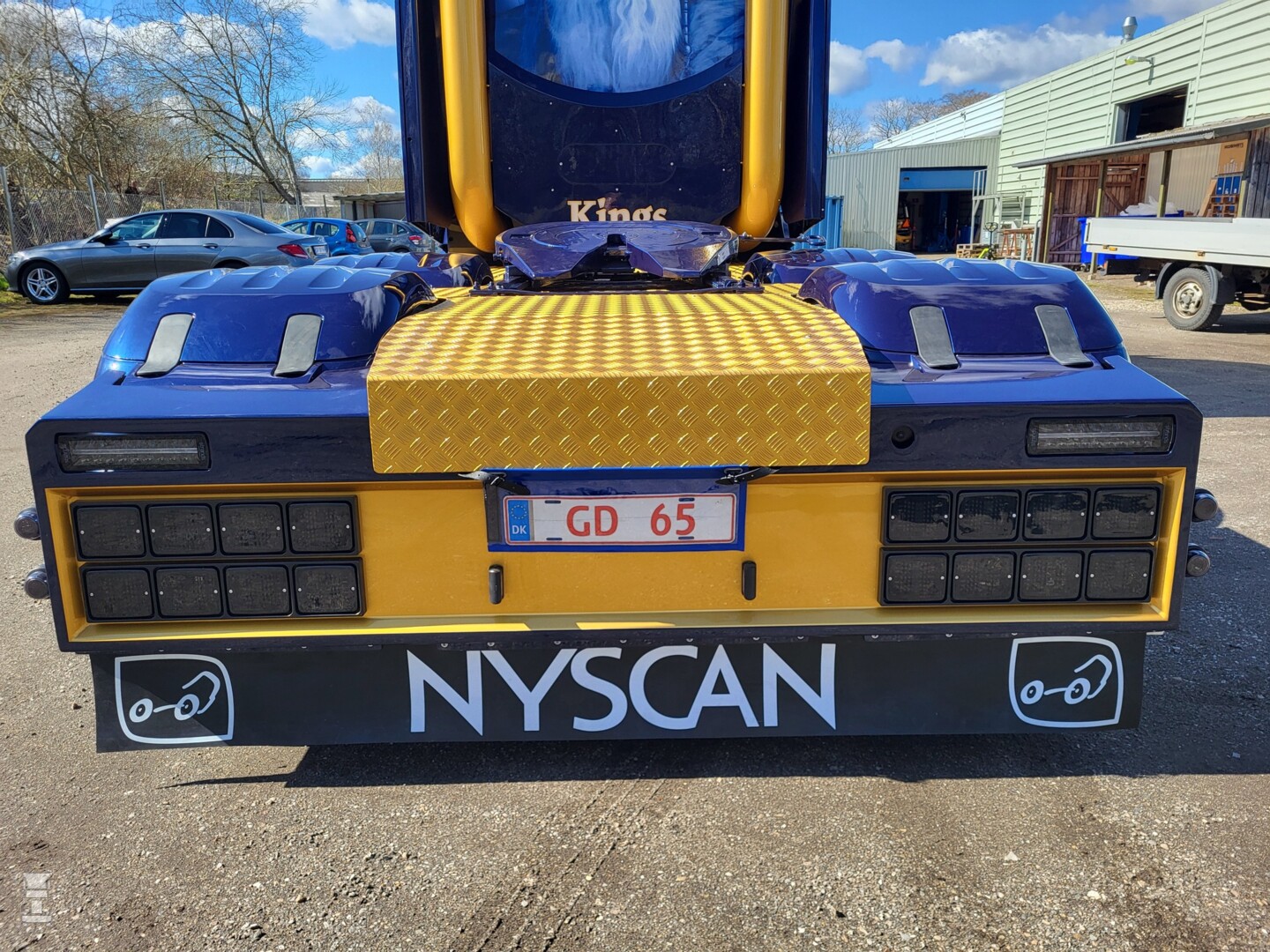 Het spuitwerk van de rest van de cabine is rustig gehouden in een fraaie donkerblauwe kleur. Verder is de truck voorzien van een keienvanger onder de voorruit, een verlengde zonneklep en windkapjes op de hoeken van het Nederlandse Go-in-Style. Boven de zonneklep zien we een grote lichtbak met extra verlichting. Opvallend genoeg is er wel gekozen voor camera's. Ook de typische inhammen achter in de voorspatborden werden in ere gelaten voor de luchtweerstand. De zijfenders zijn maatwerk, met als detail zijverlichting in de vorm van kroontjes. Merkwaardig genoeg hangt er een Nyscan spatlap achter de truck, en dat is toch echt een Scania servicepartner.