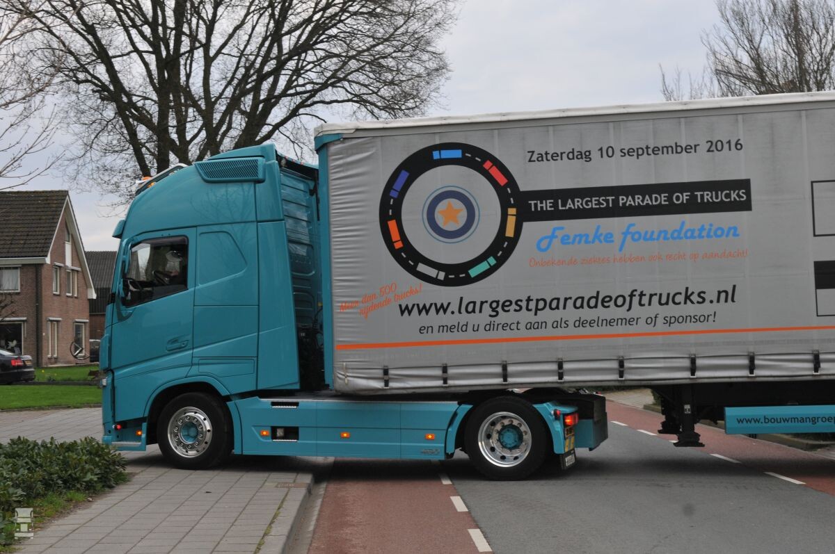 Bouwman uit Harderwijk, de werkgever van Evert, is een van de eerste sponsors. De Femke Foundation, een stichting die aandacht vraagt voor onderzoek naar onbekende ziektes bij jongeren, zoekt sponsors voor deze happening die in september plaats zal gaan vinden. De bedoeling is een kolonne van wellicht enkele kilometers te zorgen. Evert had de zeilen in orde laten maken bij Martin Vink in het Veluwse Kootwijkerbroek.
