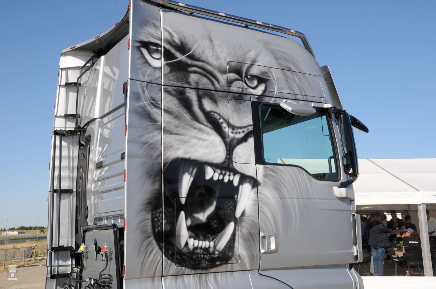 Als basis voor 'The Lion' fungeert een 18.640 trekker. Jazeker, een 4x2 trekker met 640 pk aan boord! het exterieur is op fraaie wijze voorzien van afbeeldingen. Door die in zwart-wit te houden ziet het er zeer fraai uit en we moeten zeggen dat dit de meest geslaagde Duitse MAN ooit is. Achter de cabine is een keurig slangenrek aangebracht, het chassis is voorzien van een grote tranenplaat-afdekking en ook de achterbumper is niet vergeten.