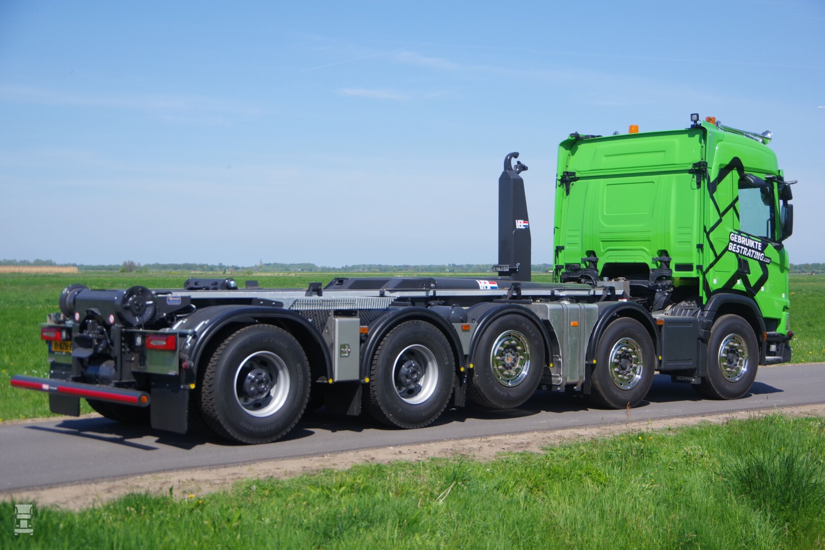 De Scania heeft een chassishoogte die belangrijk lager is dan gebruikelijk. Doordat het 40 tons VDL haakarm- afzetsysteem slechts 135 cm hoog is kunnen afzetbakken tot 265 cm hoogte vervoerd worden. Een bijkomend voordeel van de lage bouwwijze is de grote stabiliteit en de optimale afrolhoek voor afzetcontainers. Verder is de truck opvallend compact gebouwd, met een Y- vormige brandstoftank aan de rechterkant tussen as twee- en drie. De uitlaatdemper zit op de originele positie tussen as één en twee aan de zelfde kant.