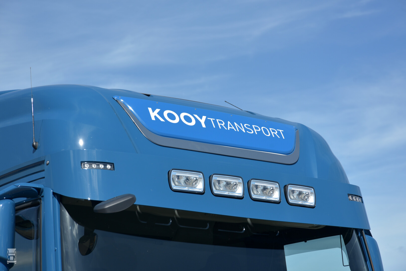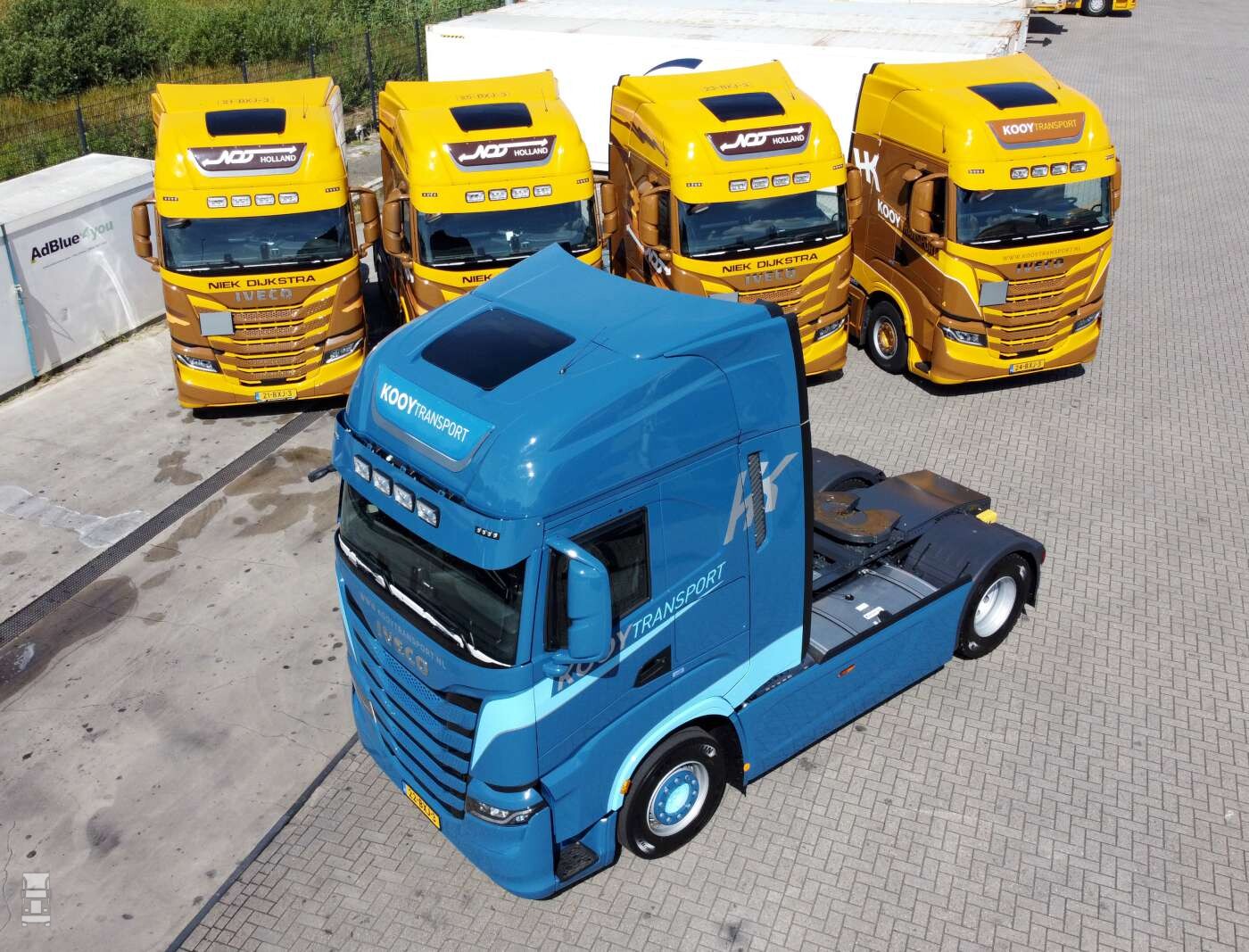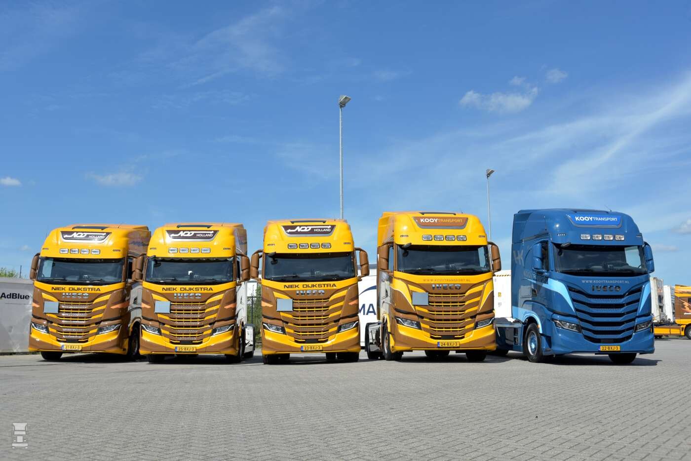 Vier van de vijf IVECO S-WAY trekkers waren inmiddels gespoten tijdens de overname, maar van één ontbrak nog de belettering, en de vijfde moest de spuitcabine nog in. Dat gaf eigenaar Sytze van der Kooy een idee: ,,We hebben toen in overleg de vierde truck in de bekende Niek Dijkstra kleuren laten voorzien van onze Kooy Transport belettering en striping. De vijfde truck hebben we toen helemaal in onze huisstijl laten uitvoeren. Daarmee krijgt de overname ook visueel een mooi plaatje, want zo is nummer vier een ‘transitietruck’ geworden, in de Niek Dijkstra kleuren met onze logo’s. Nummer vijf is volledig in de blauwe huisstijl van Kooy Transport uitgevoerd’’.