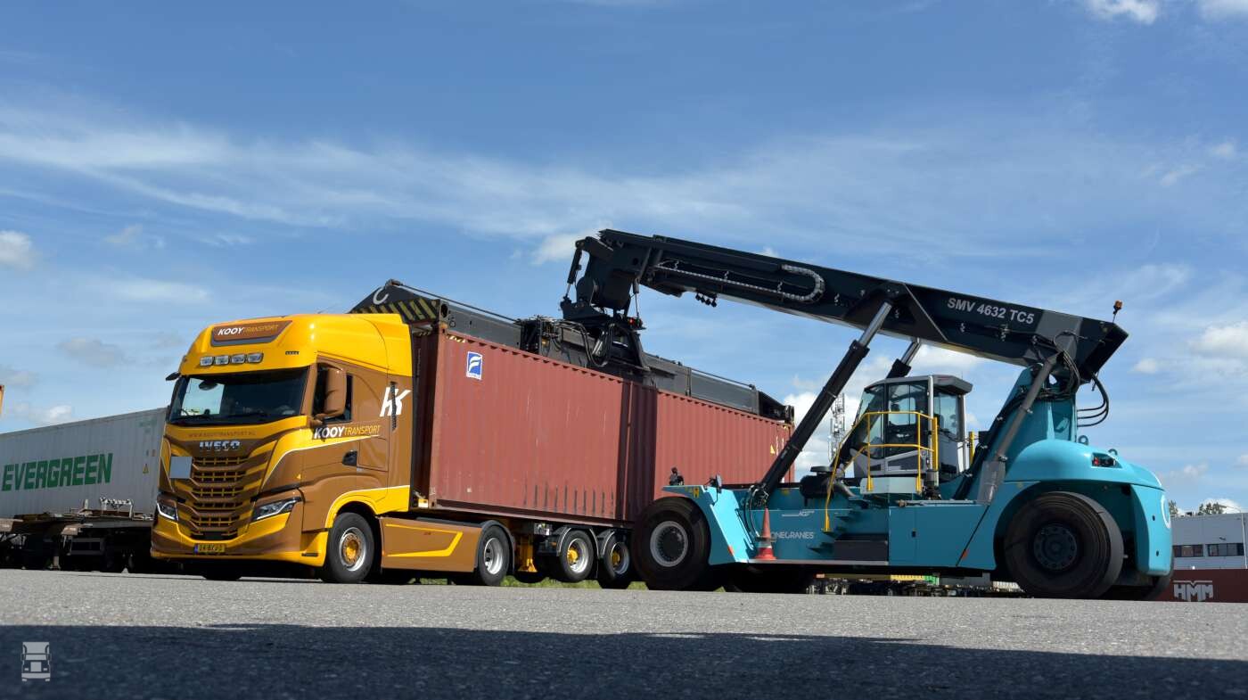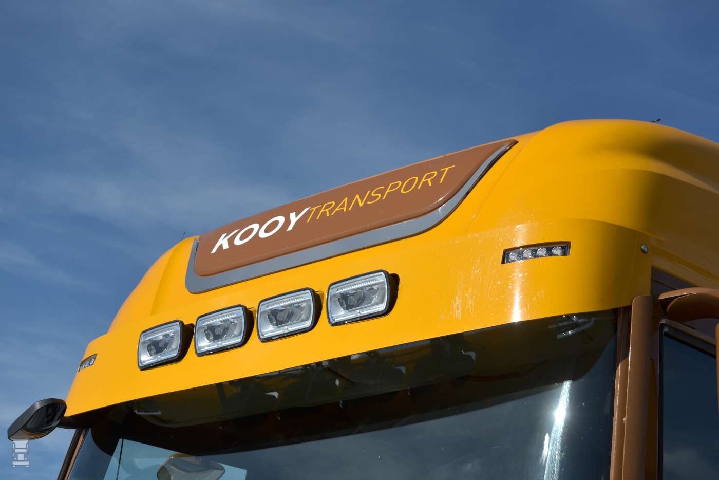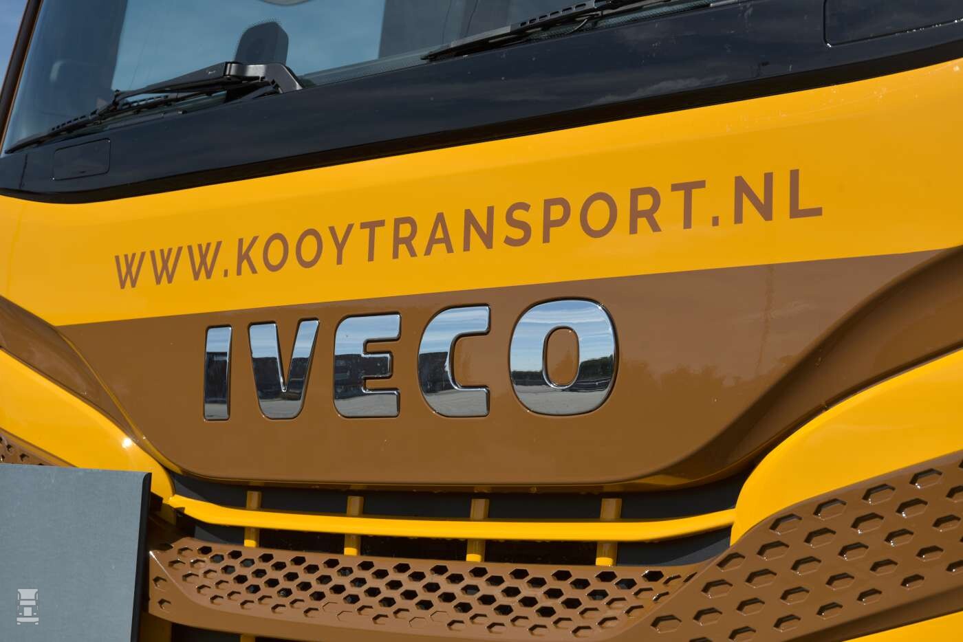 Vier van de vijf IVECO S-WAY trekkers waren inmiddels gespoten tijdens de overname, maar van één ontbrak nog de belettering, en de vijfde moest de spuitcabine nog in. Dat gaf eigenaar Sytze van der Kooy een idee: ,,We hebben toen in overleg de vierde truck in de bekende Niek Dijkstra kleuren laten voorzien van onze Kooy Transport belettering en striping. De vijfde truck hebben we toen helemaal in onze huisstijl laten uitvoeren. Daarmee krijgt de overname ook visueel een mooi plaatje, want zo is nummer vier een ‘transitietruck’ geworden, in de Niek Dijkstra kleuren met onze logo’s. Nummer vijf is volledig in de blauwe huisstijl van Kooy Transport uitgevoerd’’.