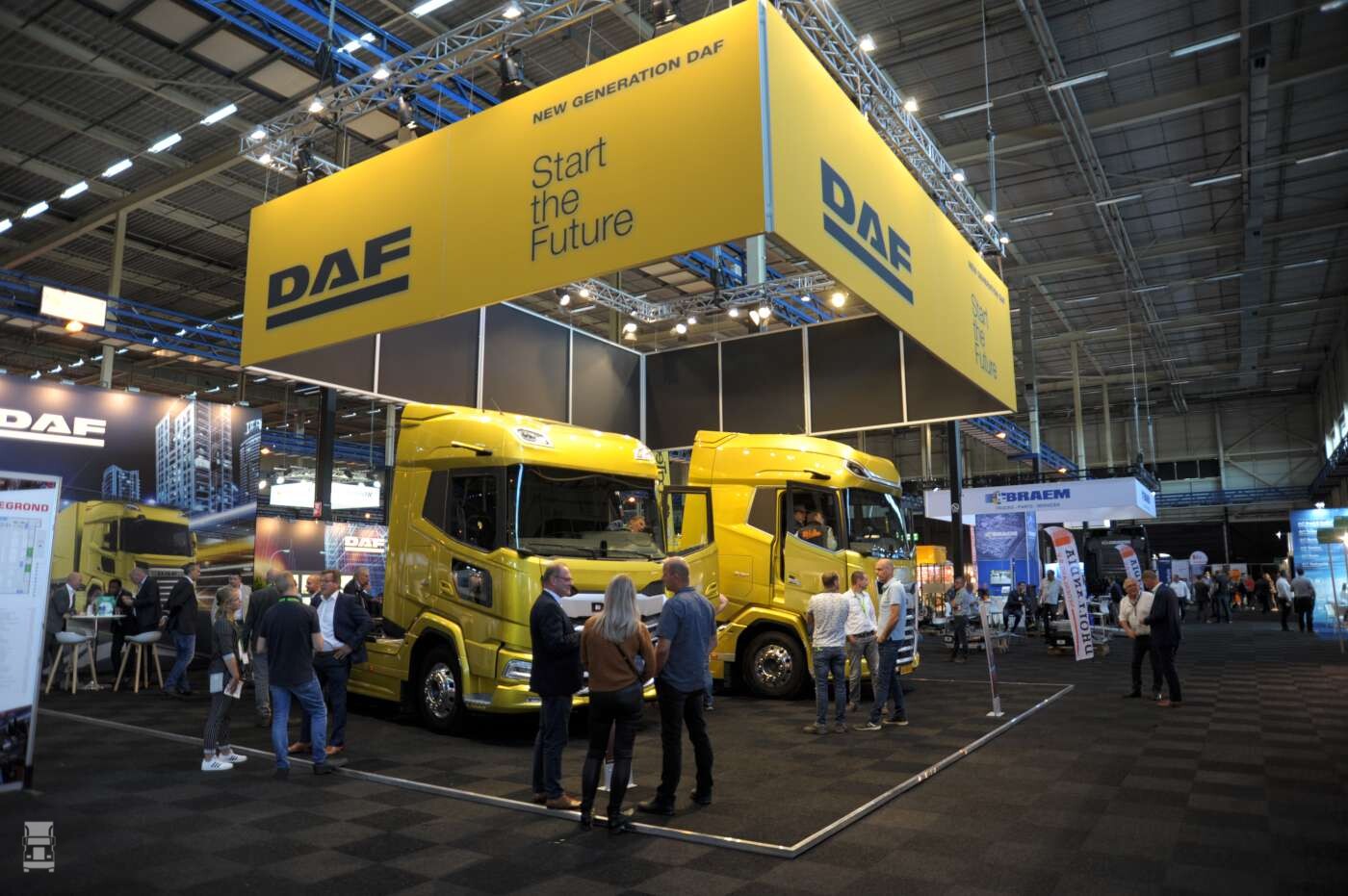 Enorm druk was het bij de DAF stand. Transport Compleet is de eerste vakbeurs in ons land waar de nieuwe generatie van DAF te zien is en menigeen wil wel even een kijkje nemen in de cabines. Op de beurs staan een nieuwe XF en een XG+ model. Verder zijn er veel stands van toeleveranciers van banden, smeermiddelen, services en opleggers. Nieuw is bijvoorbeeld Berger Ecotrail met lichtgewicht opleggers, maar ook het merk Goldhofer is vertegenwoordigd, net als bijvoorbeeld Kögel. Ook nieuw is het Turkse Aksolyu met een zogenaamde 'truckambulance'. Op de foto's een sfeer impressie van de beurs.