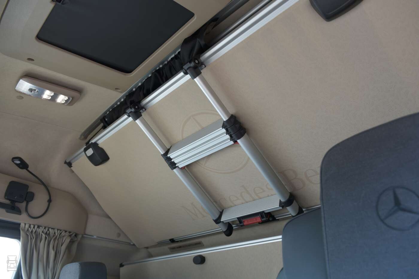 Vanaf de introductie van de huidige Actros, inclusief de ProCabin generatie viel het op dat er geen laddertje naar het bovenbed leverbaar was. Dat betekende dat je op het dashboard moest stappen om jezelf in het bovenbed te hijsen. Daar is nu dus een oplossing voor, in de vorm van een fraai aluminium, uitschuifbaar laddertje. Vooral voor dubbele bemanningen een handige optie, die je voor zo'n vierhonderd Euro kunt bestellen via de dealer.