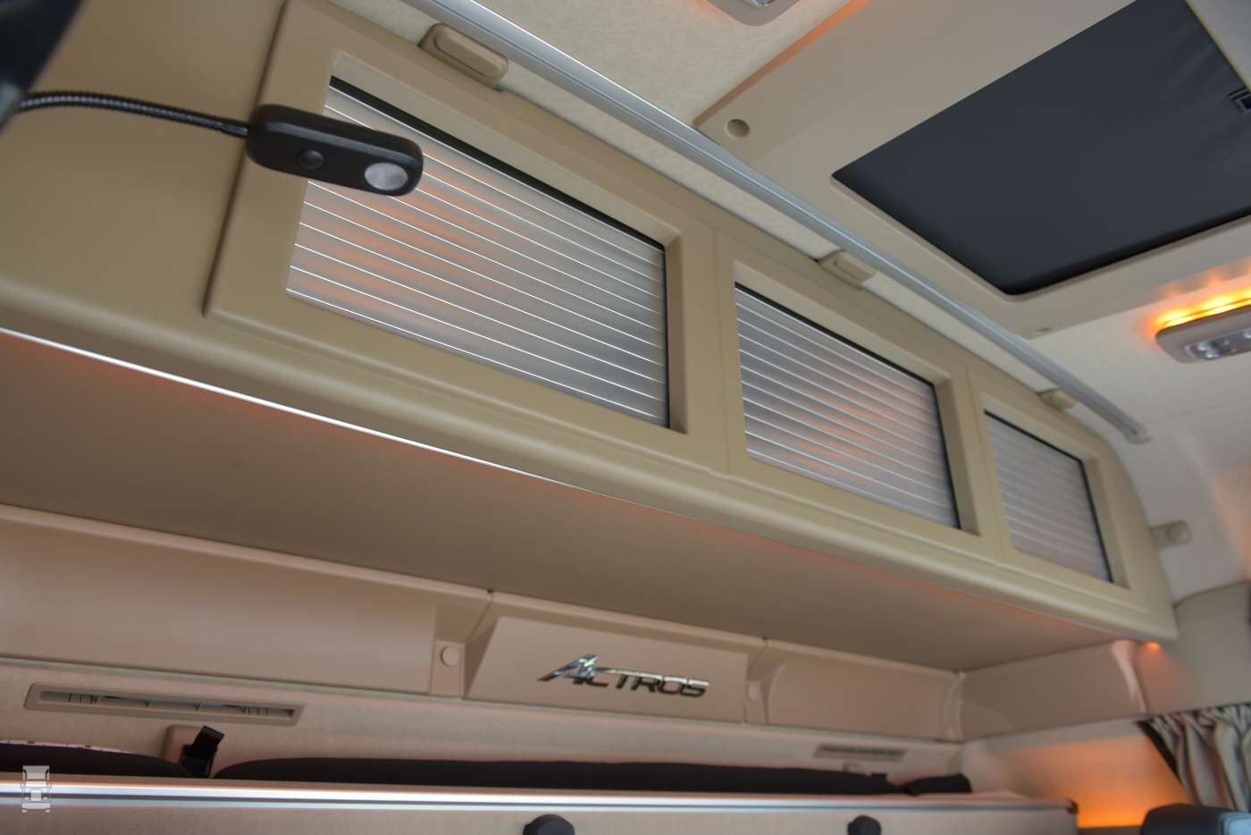 Ander nieuws voor de Actros is een kastenwand tegen de achterwand van de cabine, op de plaats van het bovenbed. Voor wie alleen onderweg is een mooie uitbreiding van de opbergruimte in de Actros. Deze kastenwand is niet leverbaar in combinatie met een bovenbed, en ook dit is een originele accessore. Erg fraai is dat de 'moodlights' doorlopen onder de kastenwand.