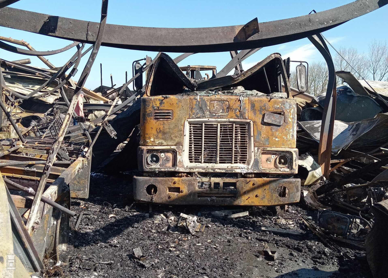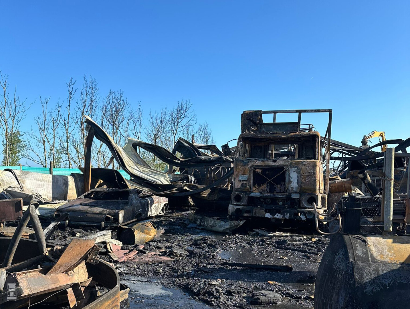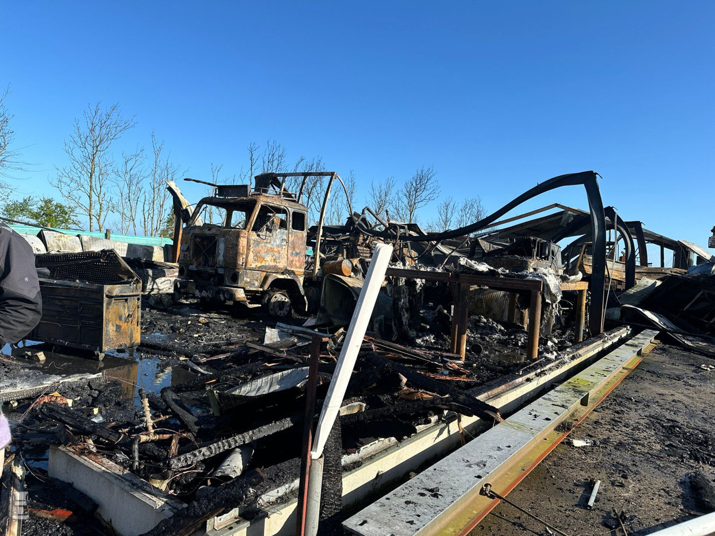 Op de foto's zie je de trucks zoals ze er tot gisteren bij stonden, en wat de gevolgen zijn van de brand.