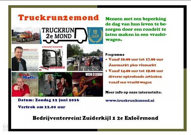 Morgen, zondag 12 juni wordt in 2e Exloërmond voor de tiende keer een grote truckrun georganiseerd. Naar schatting 250 trucks zullen een fraai konvooi vormen en hun speciale bijrijders de dag van hun leven, of in ieder geval de dag van het jaar bezorgen.