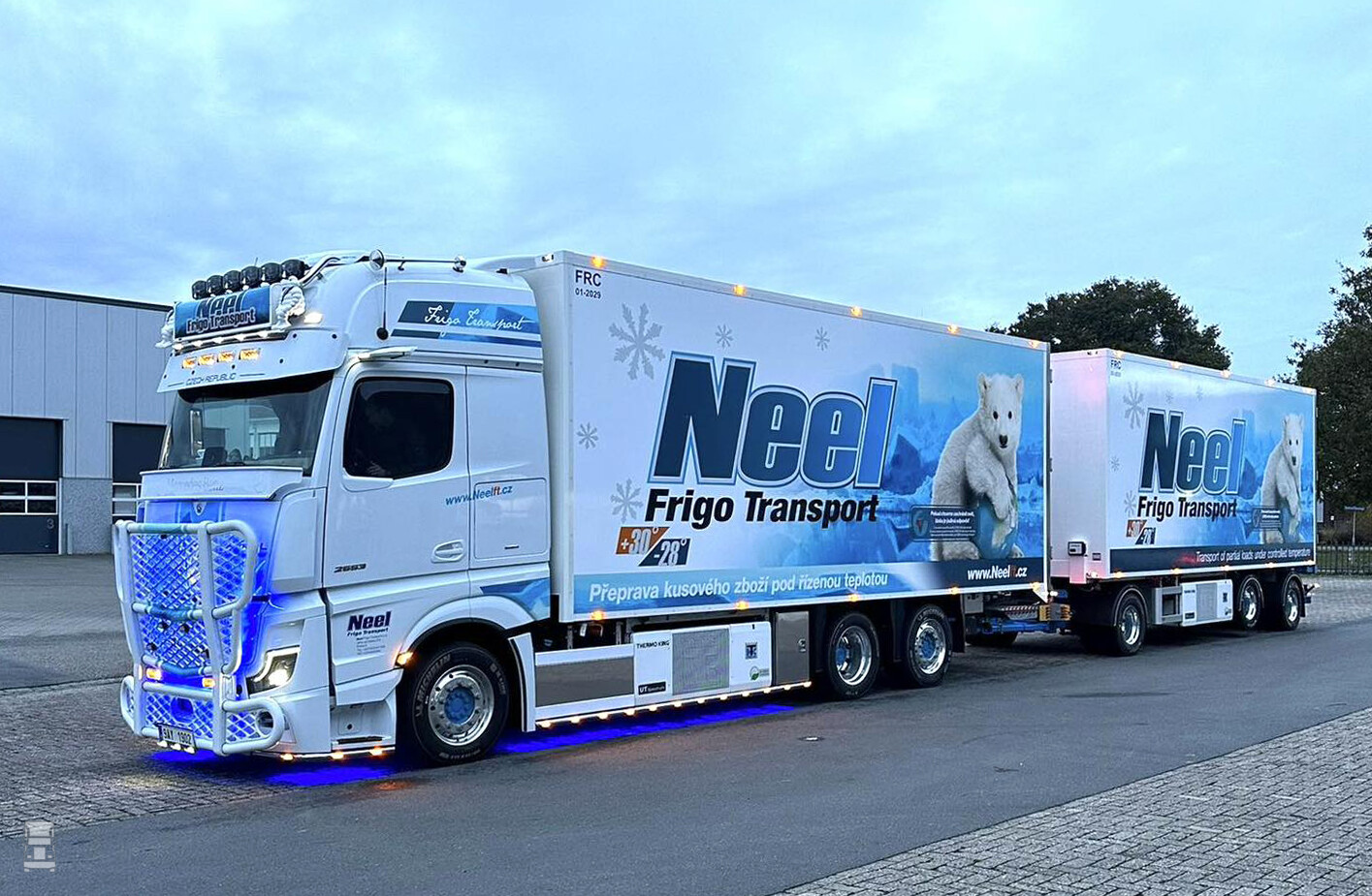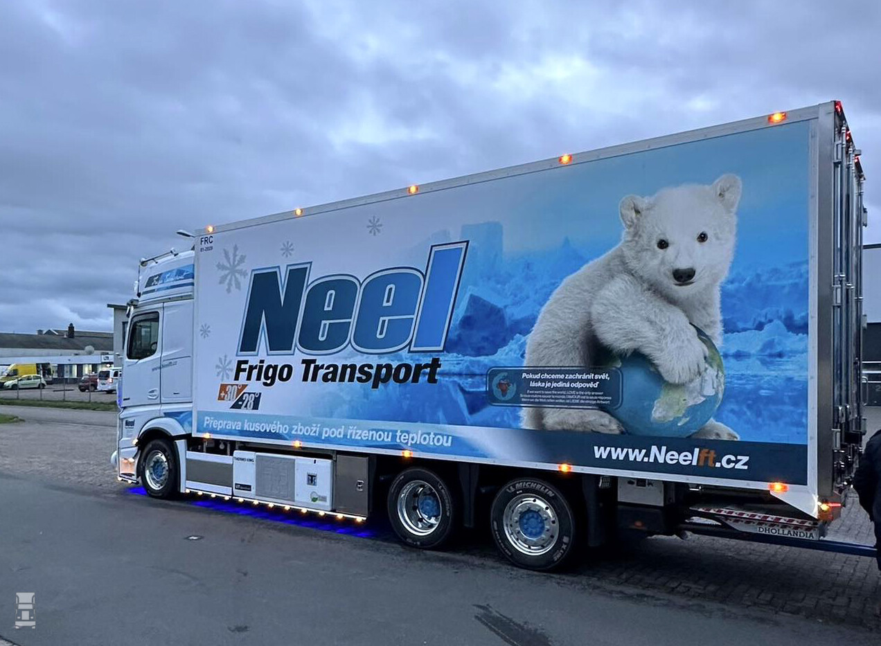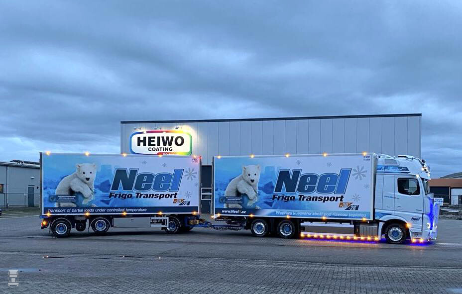 De drie- assige Heiwo schamel aanhangwagen heeft een pneumatisch verstelbare trekboom waardoor deze ingekort kan worden voor het doorladen. Verder zijn er op de aanhangwagen 19.5 inch wielen gemonteerd met 265/70R19,5 banden in dubbele montage. Het hele span staat op Alcoa Dura Bright wielen. De Thermo King multi temp onderbouw koelmachines verdelen de carrosserieën in een vries en koelgedeelte. Nadat Heiwo de combinatie had opgebouwd gingen ze in Tsjechië helemaal los met accessoires en lampjes. Samen met de opvallende reclame zorgt dat voor een fraai totaalplaatje.