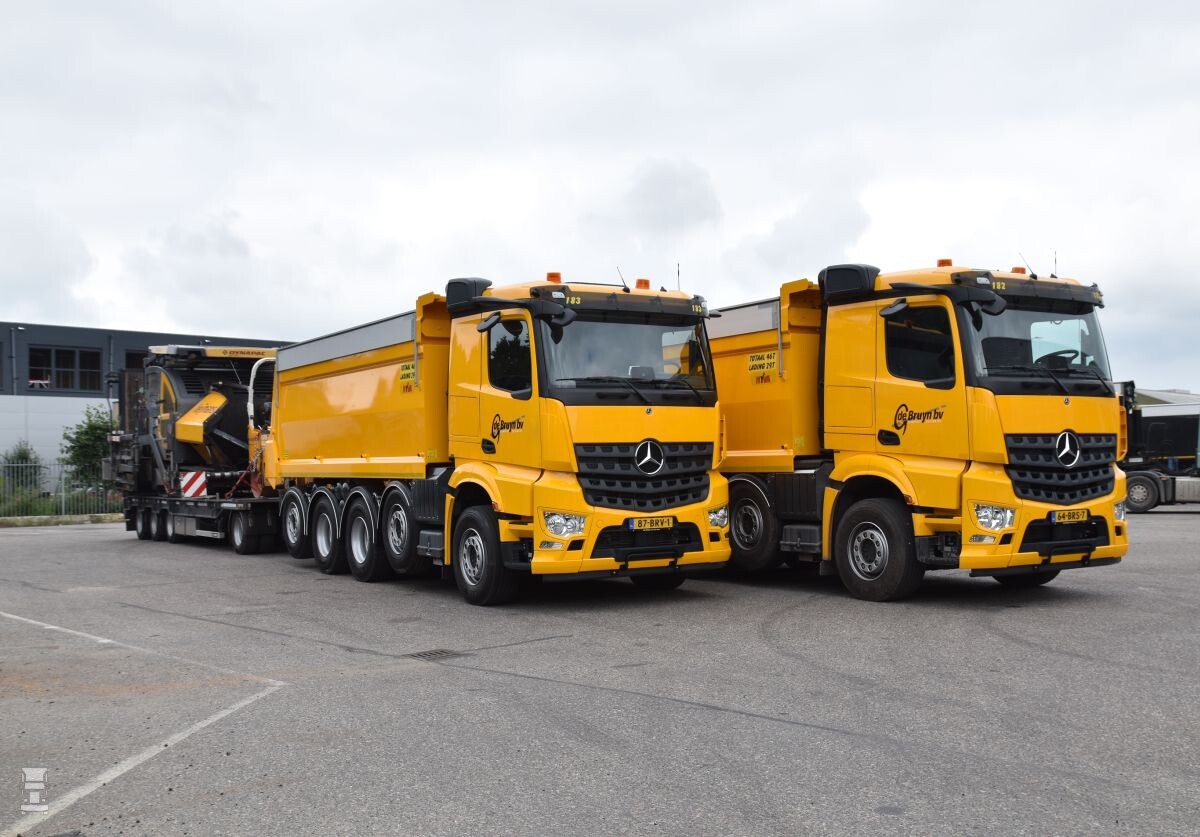 G. de Bruyn BV uit Oudewater heeft een vloot van 85 eigen trucks. Het bedrijf is met name actief in het vervoer van losgestorte grondstoffen voor de bouw en de wegenbouw. De nieuwste aanwinst in de vorm van de twee gele Mercedes-Benz kippers worden vast ingezet in de asfaltploeg van Heijmans Wegenbouw. Door de compacte bouw van de nieuwe vijf-assers kunnen de trucks binnen de wettelijke afmetingen met de dieplader naar het werk, terwijl ze daarna als volwaardige vijf-assers mee kunnen rijden bij de aanvoer van asfalt. Belangrijk hierbij is de totale lengtemaat tussen voorbumper en vangmuilkoppeling. Die bedraagt exact acht meter, waarbij de vangmuilkoppeling zodanig gepositioneerd is dat manoeuvreren geen problemen zou moeten opleveren.