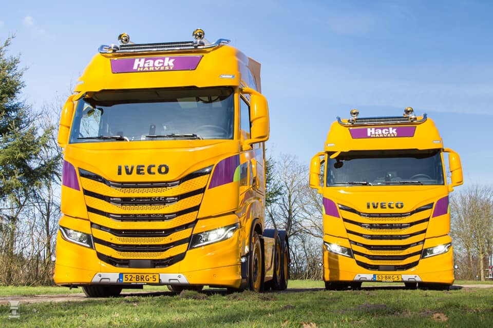 Hack Harvest in Kruisland heeft twee opvallend geel gespoten Iveco S-Way trekkers in gebruik genomen. Het gaat om 6x2 trekkers met de Cursor 13 krachtbron met 570 pk. De trucks worden ingezet in combinatie met diepladers voor het vervoer van allerlei machines.