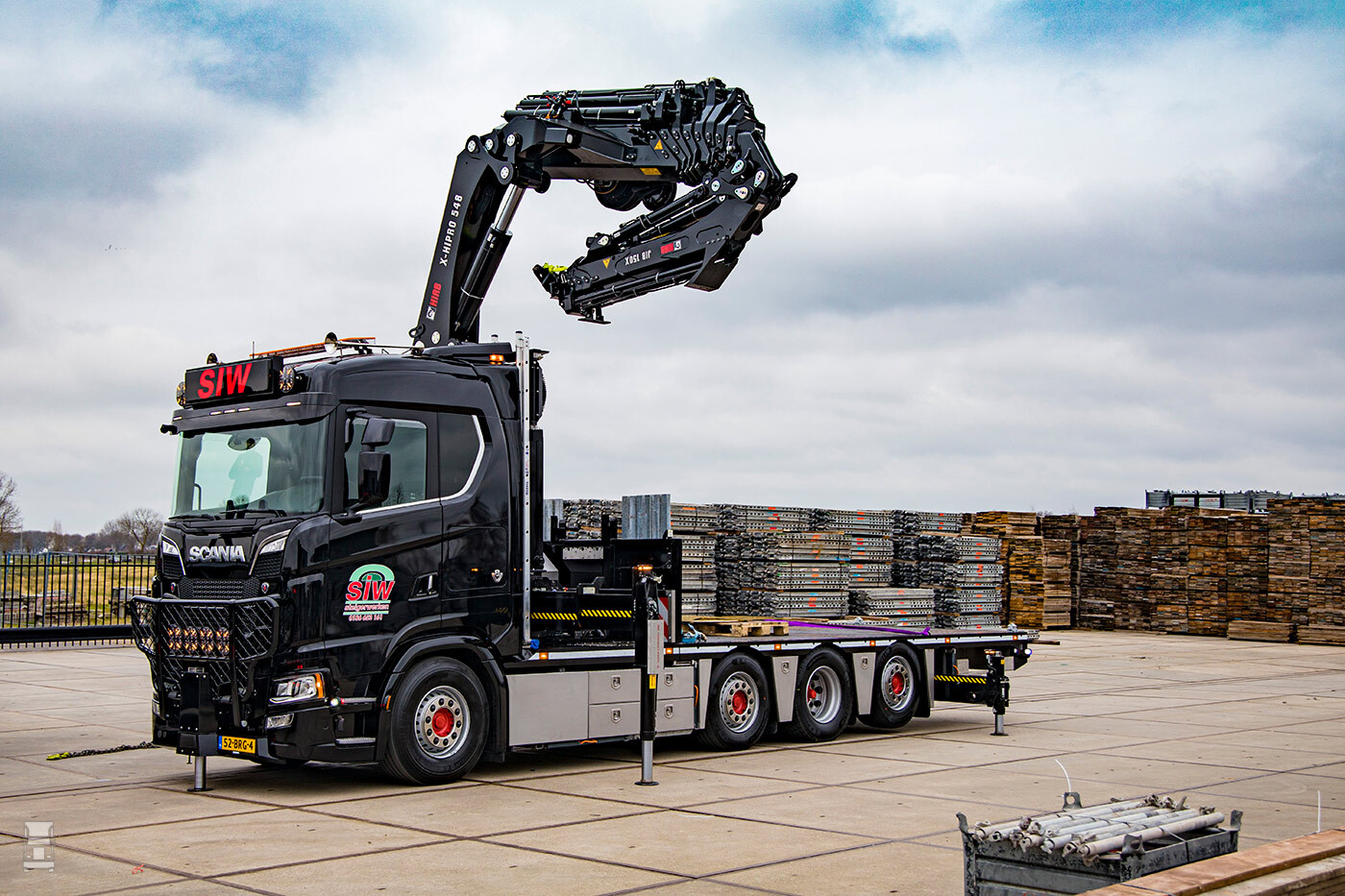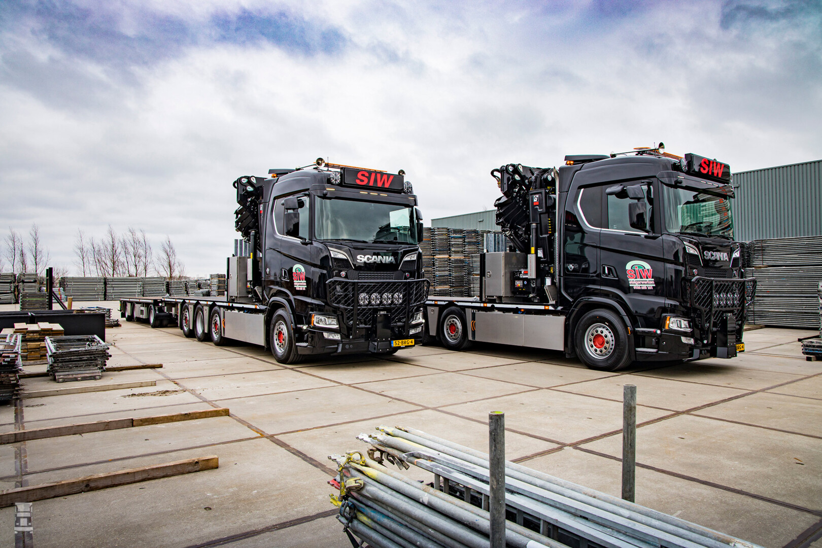 Steigerbouwbedrijf SIW uit Numansdorp rijdt sinds deze maand met een compleet nieuw wagenpark. Eigenaar Ad van der Meer verving zijn beide trucks door twee nieuwe Scania 520S V8 8x2/*6 bakwagens met een gestuurde voorloop- en naloopas en met daarop een vijf keer gestempelde Hiab 54 ton/m cabinekraan. Ook de bijbehorende schamelaanhangwagens zijn vervangen.