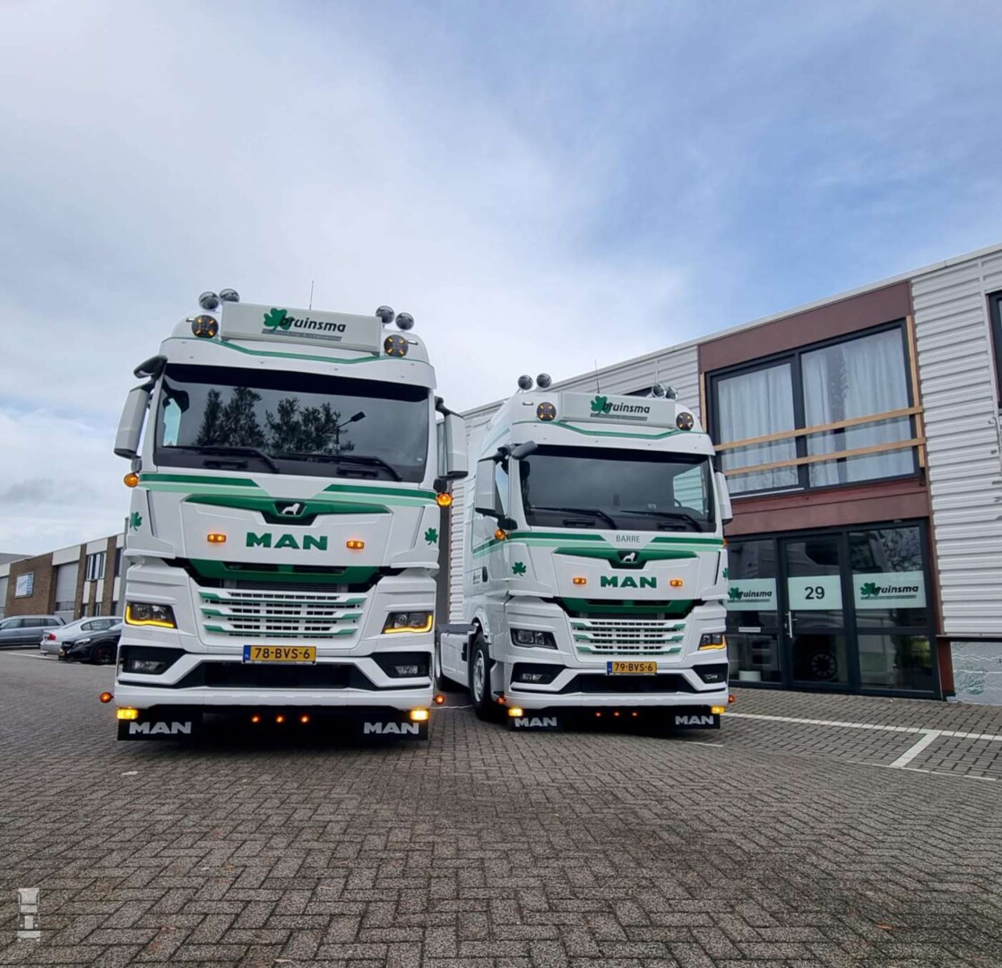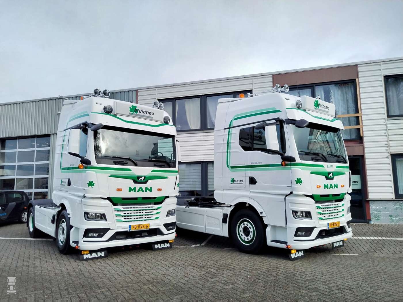 Met een set echte Deense daglampen, spatlappen onder de voorbumper en een stoere lichtbak met verstralers er naast zien de nieuwe MAN trucks er strak uit. De trucks worden ingezet in het containertransport. De MAN trucks werden geleverd door MAN dealer Van Leeuwen Truckservice in Maasdijk.