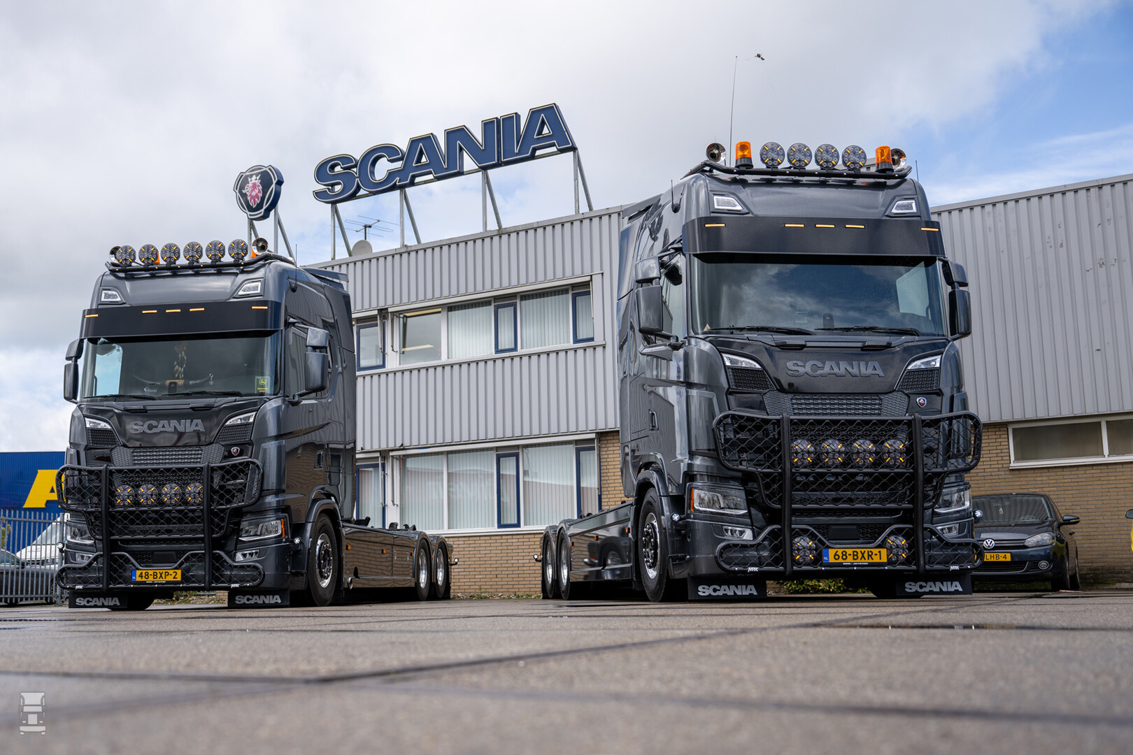 De beide trucks zijn nagenoeg identiek. Zo hebben ze allebei een 6x2 configuratie. “De vooras hebben we bewust op 10 ton gezet. Dit geeft net iets meer reserve als er een keer iets heel zwaars voorop ligt. Dat kunnen we overigens heel mooi zien op het dashboard want de aslastindicatoren op de luchtvering zijn binnen 100kg nauwkeurig. Zo staan we nooit voor verrassingen.” Opvallend is dat er op beide trucks geen naam op de deur staat. “We wilden ze héél strak hebben, echt ingetogen chique. Daarnaast vinden sommige van onze klanten het prettig als wij met een neutrale auto voor de deur komen.” Dat is dan maar hoe je het bekijkt. Want naam of geen naam, beide trucks zijn zo herkenbaar en écht een statement op zichzelf dat ze alleen daardoor al opvallen.