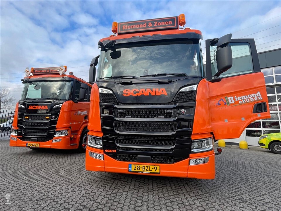 De Scania’s 460R 8x4*4 hebben een haakarmsysteem en een Palfinger kraan. Deze zijn opgebouwd door J.L. Muns uit Hardinxveld-Giessendam. De opvallende oranje kleur kregen beide vrachtwagens bij Scania in Zwolle. Daar zijn de auto’s ook opgebouwd volgens de wensen van Biemond & Zonen. Scania Alblasserdam leverde de vrachtwagens af.
