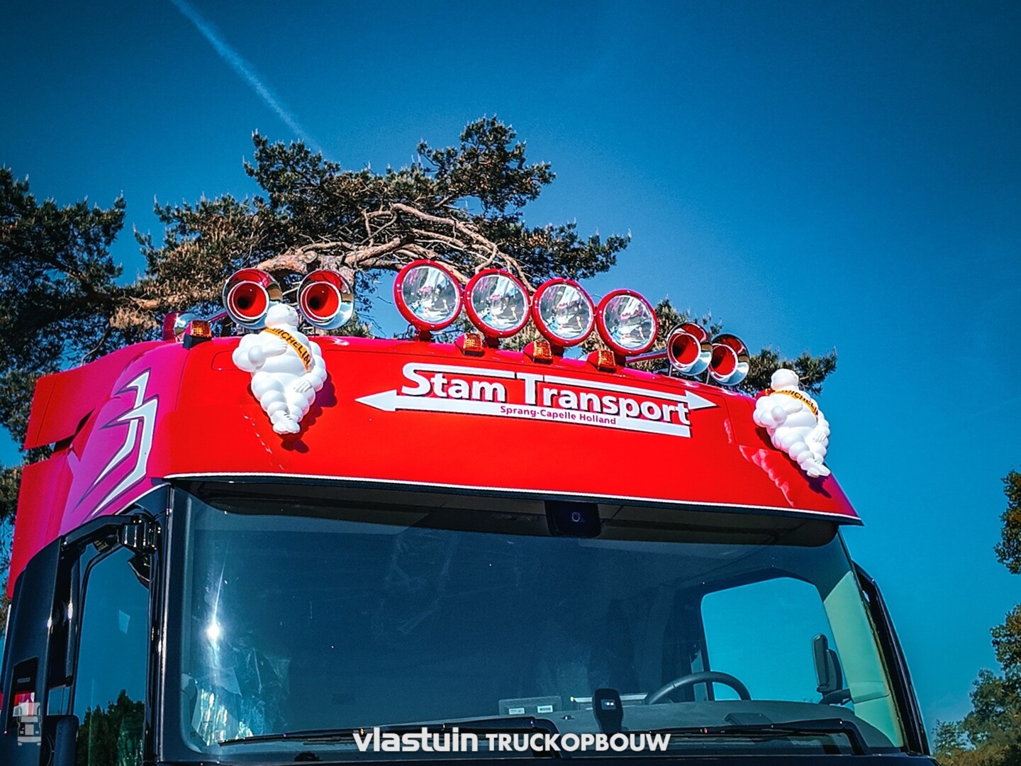 Het resultaat mag gezien worden, zeker in de huisstijl van Stam Transport. De trucks zijn bijzonder compleet uitgerust met te veel opties om hier op te sommen. Nummer 9 is helemaal in de kleuren van Stam Transport uitgevoerd, nummer 10 heeft een eigen stijl en de naam Adwin Stam in de lichtbak. Deze truck is bovendien uitgevoerd met fraaie special paint details op de vlakke achterwand van de cabine. De trucks werden geleverd door Bas Truckcenter.