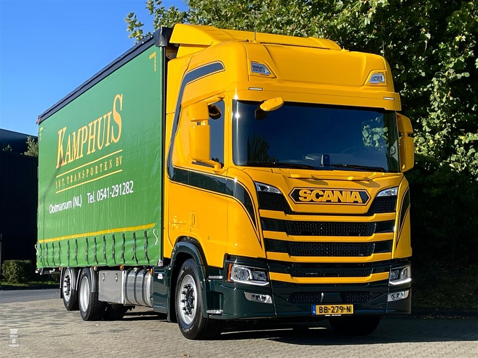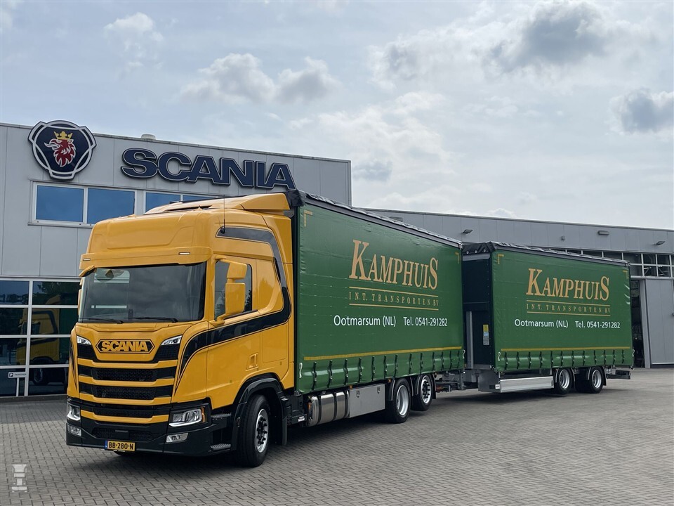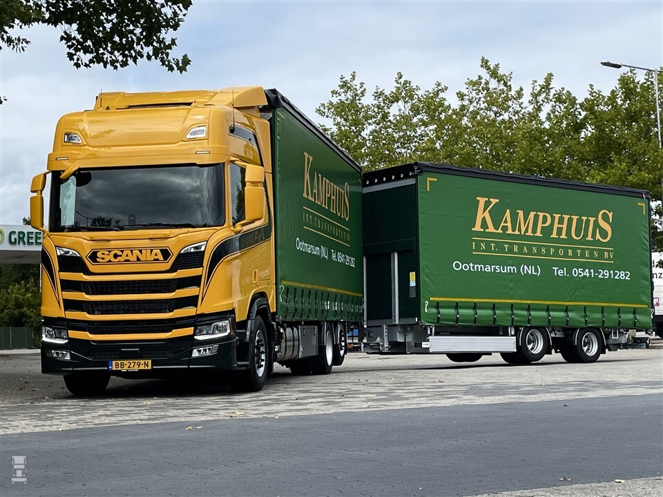 Onlangs werd het tweede exemplaar afgeleverd aan Kamphuis. Beide Scania-combinaties zijn vrijwel identiek. Beide zijn Scania R460 6x2 bakwagens met een gestuurde naloopas, gekoppeld aan een nieuwe middenas-aanhanger. De combinaties zijn extra laag opgebouwd. De gele lak op de cabine kleurt fraai bij het groen van de zeilen. Een enkele streep maakt het geheel af. De combinaties zijn schitterend in hun eenvoud.