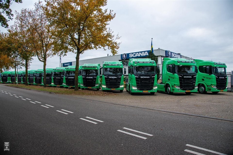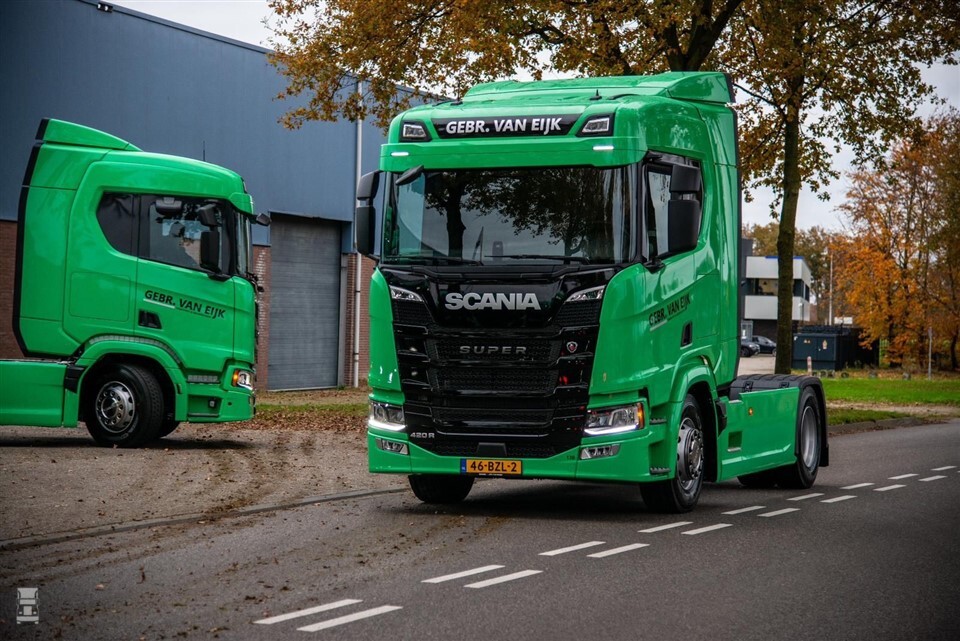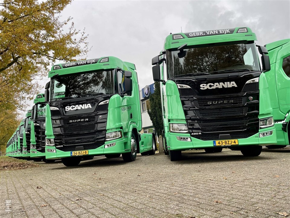 De twintig nieuwe vrachtwagens voor Gebroeders Van Eijk zijn alle voorzien van de Super-motor met 420 pk. Daarnaast heeft elke cabine het nieuwe digitale dashboard. In hun groene kleur zien de nieuwe Scania trekkers er fris uit. Dit komt ook door de meegespoten sideskirts. De reclame op de trekkers is aangebracht door De Kleverij.
