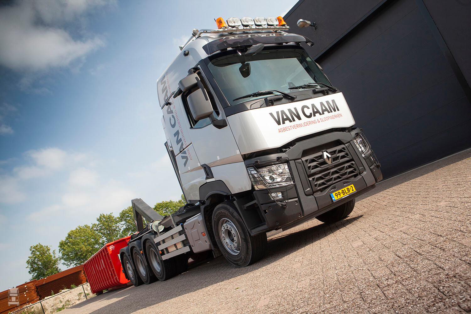 De eerste Renault Trucks-bakwagen in het wagenpark van Van Caam is multifunctioneel en wordt dan ook ingezet voor verschillende typen werk, zoals vervoer van bouw- en sloopafval, asbest en puin. De Renault Trucks C heeft een 13-liter motor met een vermogen van 520 pk. Er is gekozen voor een 8x4 chassis met Tridem (1+3) asopstelling. De dubbele aandrijving zorgt voor een goede tractie, de wendbaarheid wordt vergroot door de gestuurde en hefbare sleepas.
