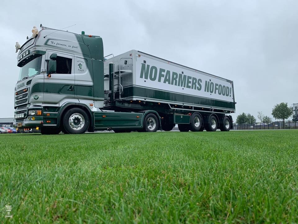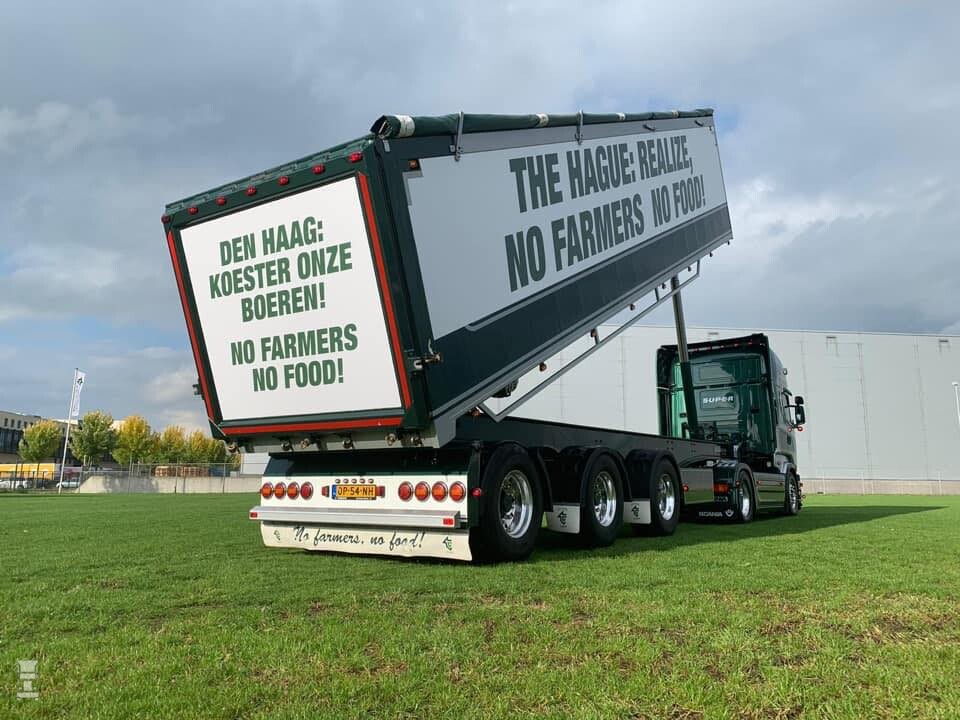 Bij Van Triest Veevoerders rijden ze al jaren met de slogan 'No Farmers No Food' maar voor deze gelegenheid zijn er nu ook kippertrailers volledig beplakt met deze kreet. Voor een deel is dat natuurlijk eigenbelang, want met een inkrimping van de veestapel zal ook de behoefte aan veevoer dalen. Toch is het mooi dat een bedrijf als Van Triest zich publiekelijk inzet voor de belangen van de sector.