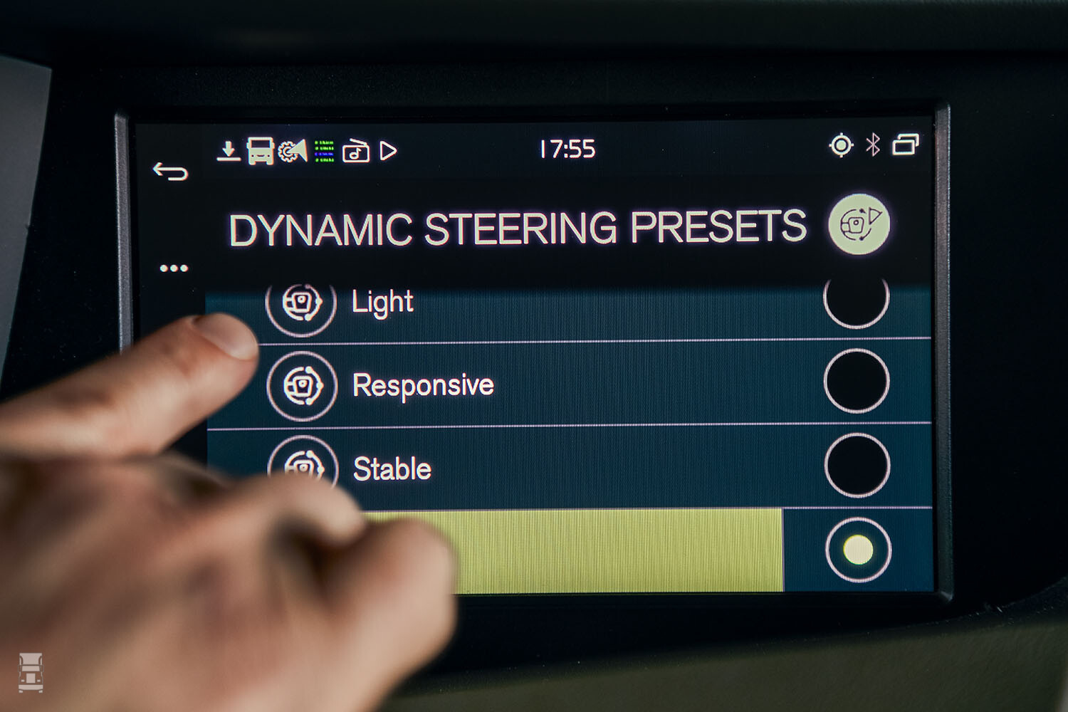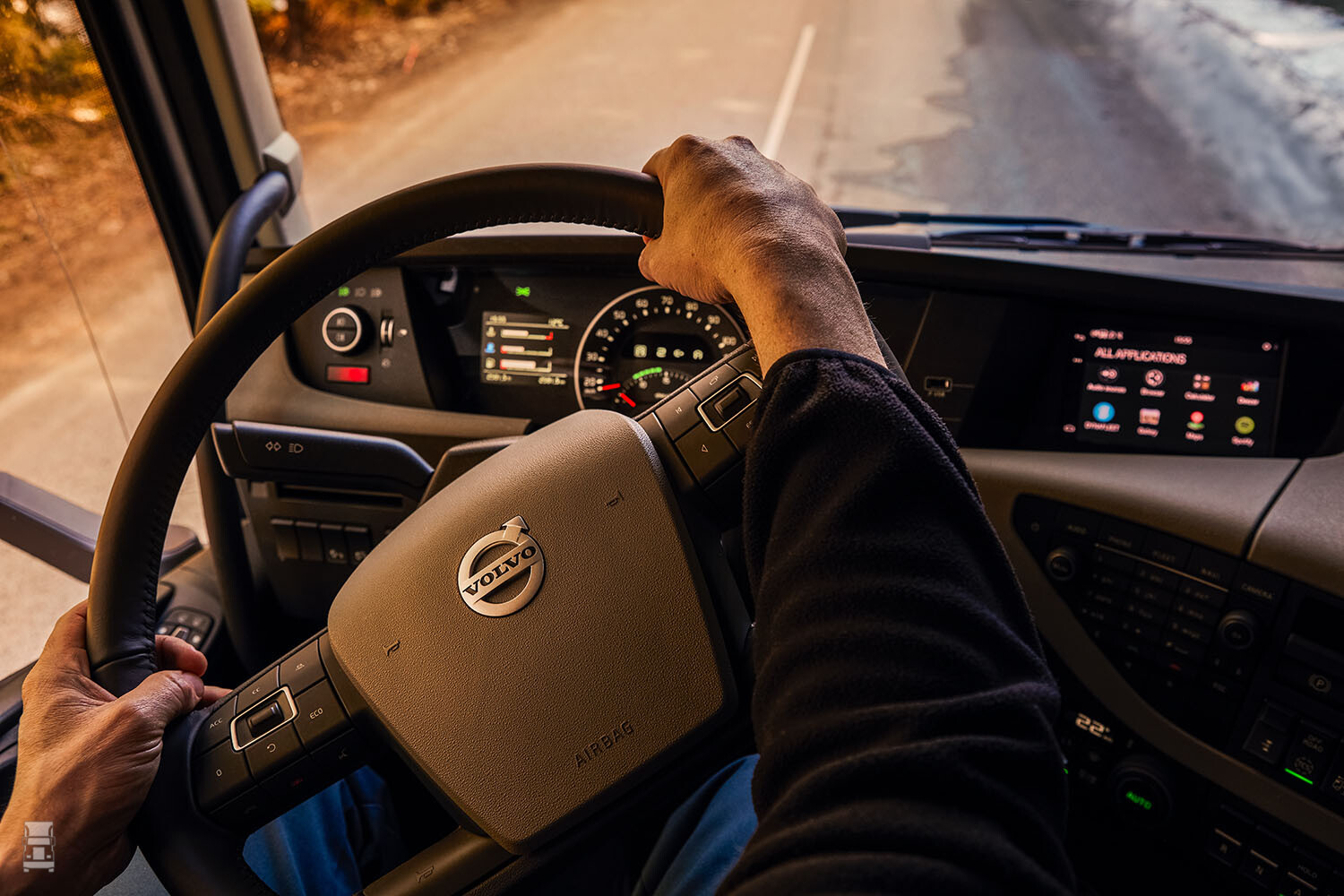 Daarmee is het geen zelfsturende truck, want je moet wel gewoon het stuur vast houden. Als je het loslaat dan krijg je meteen een waarschuwing, overigens net als in de Actros. Bijzonder bij Volvo is dat je zelf een aantal besturingselementen kunt aanpassen naar jouw eigen smaak. Zo kun je als chauffeur zelf de gevoeligheid instellen van het systeem en hoe licht het sturen gaat. Ook kun je persoonlijk instellen hoe hard de Volvo terugstuurt als je over de lijntjes gaat. Deze persoonlijke instellingen van iedere chauffeur worden opgeslagen op de bestuurderskaart. Daardoor hoef je het maar één keer in te stellen, en dat is handig!