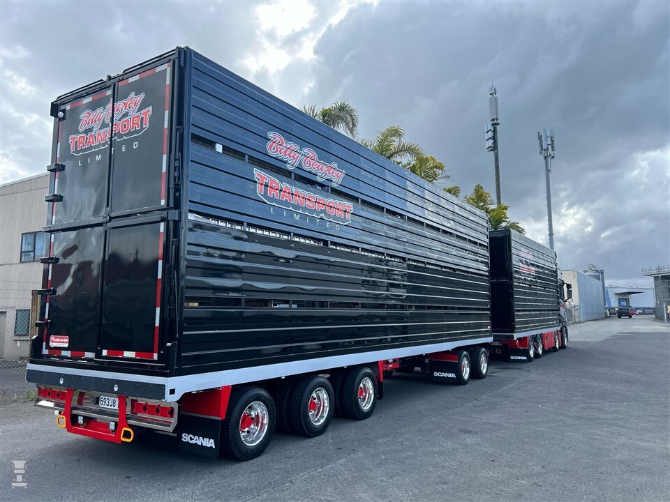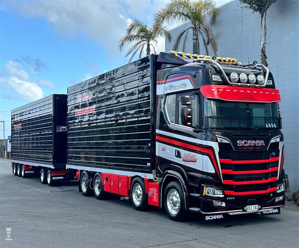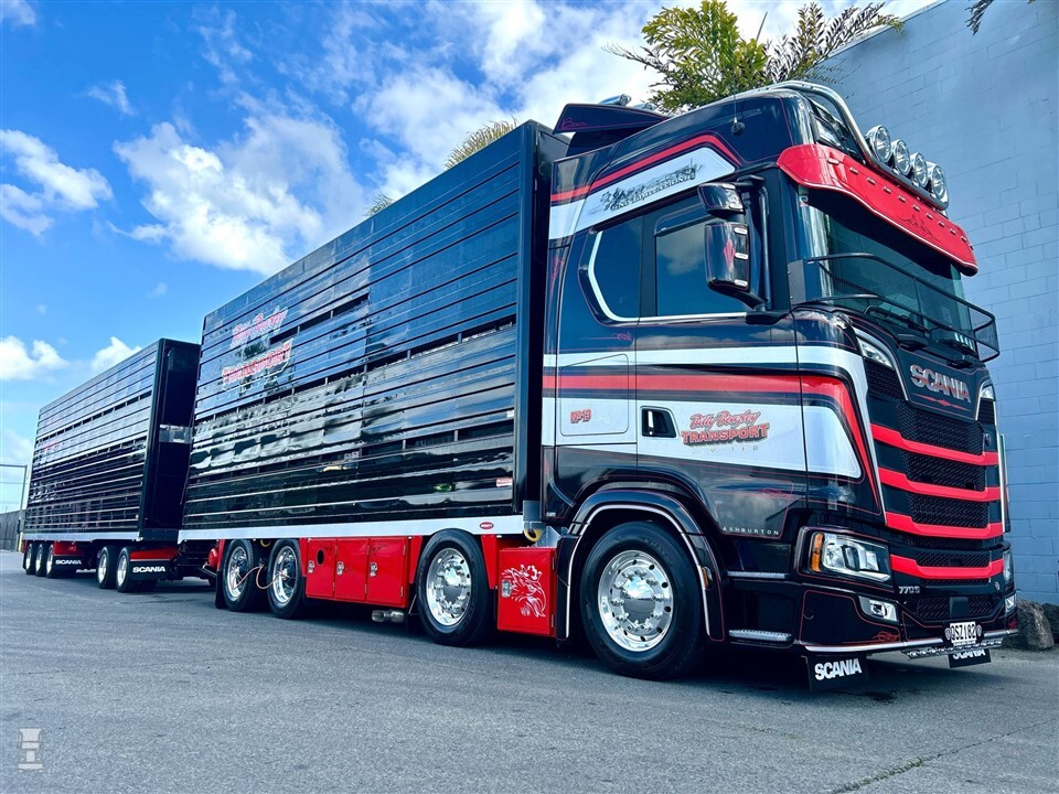Ook in Nieuw Zeeland is de Scania V8 zeer geliefd. Dat blijkt maar uit de combinatie van Billy Beazley. Dit is kracht in optima forma: een 770 pk sterke V8 in een indrukwekkende combinatie voor het vervoeren van vee. De vierassige motorwagen in combinatie met een vijfassige aanhanger oogt erg stoer. Aan alle details zijn gedacht, van het mooie spuitwerk tot de accessoires en de uitrusting voor de chauffeur.