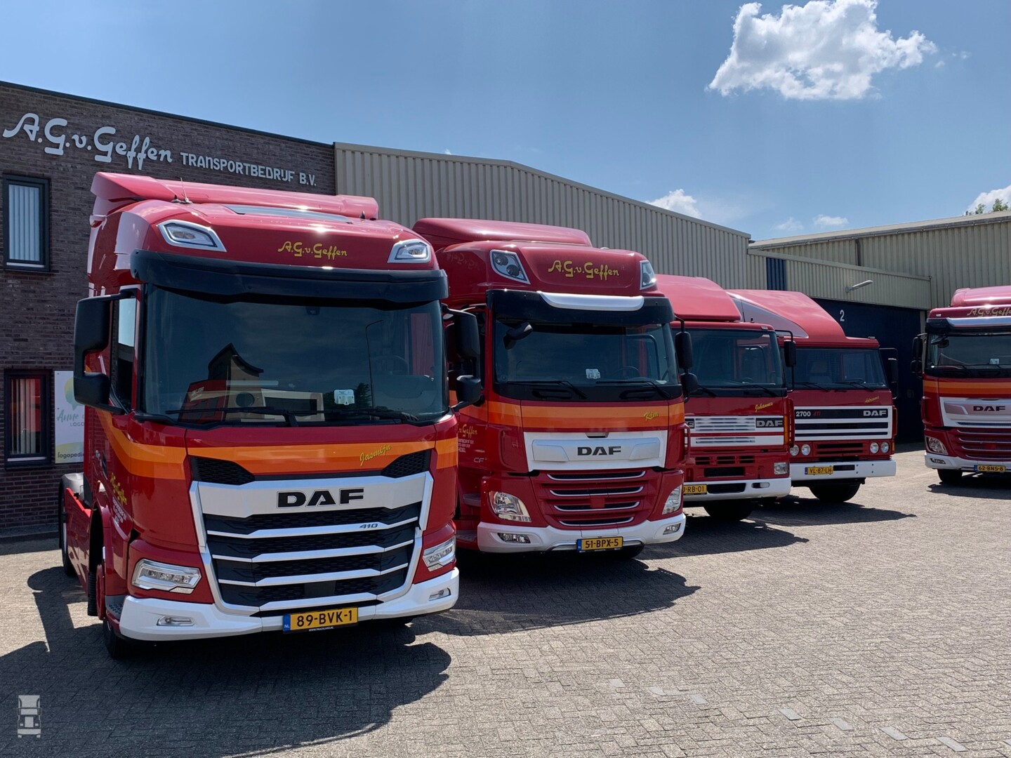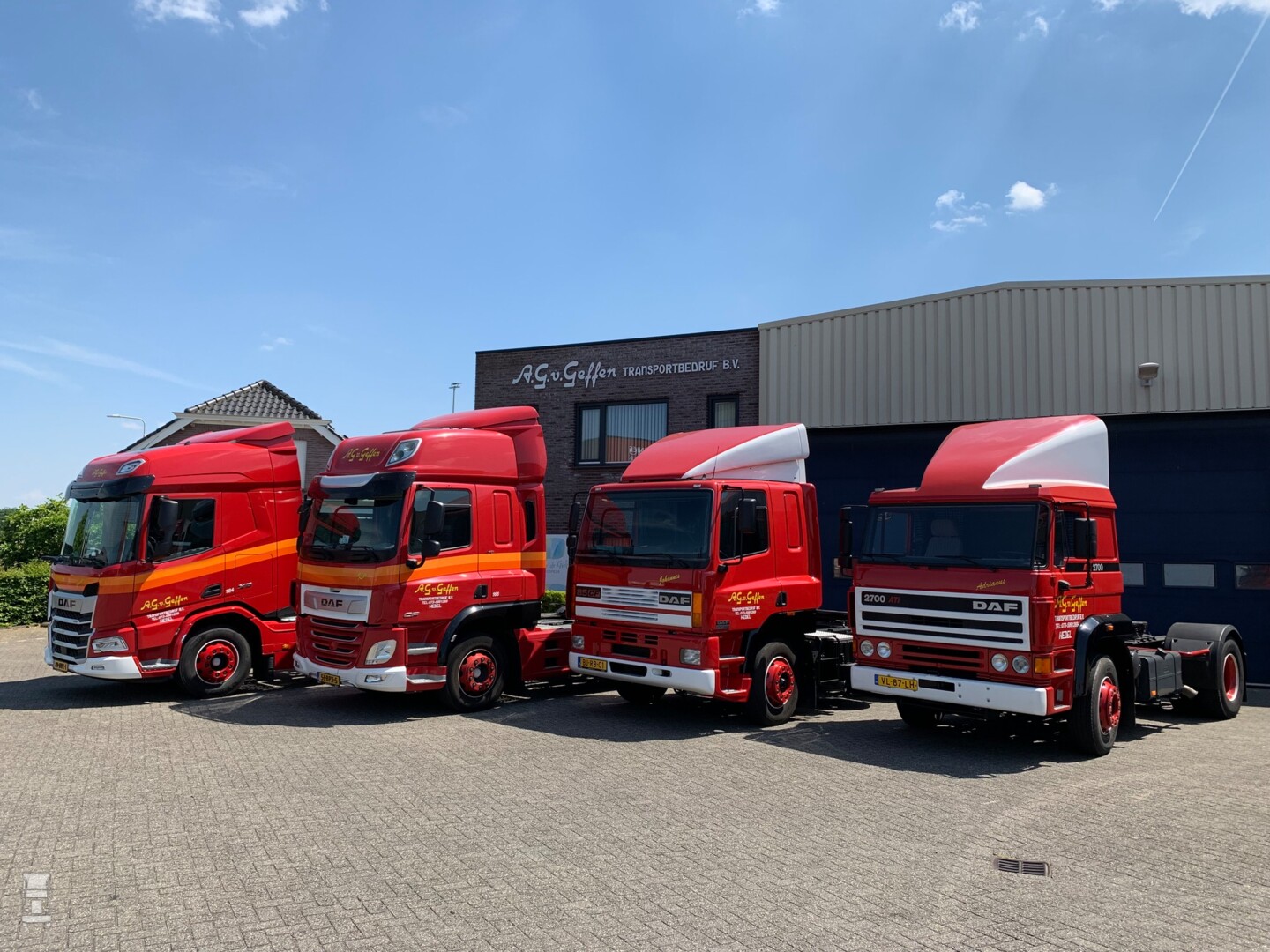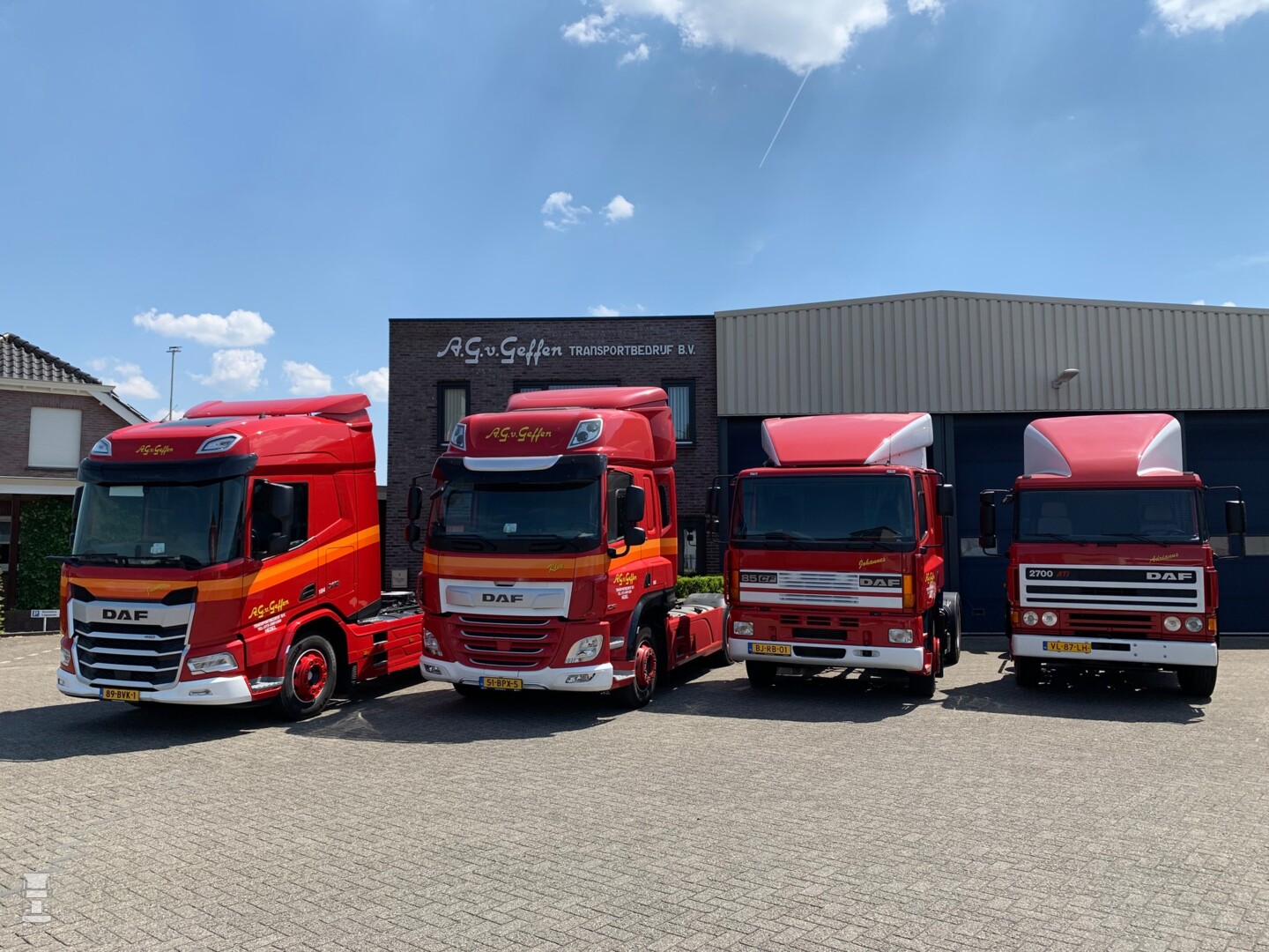 In het rijtje zien we een DAF 2700, een DAF 85 CF, een DAF CF85.400 Space Cab en een nieuwe DAF XD 410 Space Cab naast elkaar staan. Opvallend is hoe de cabines niet alleen steeds groter werden, maar ook dat de raamlijnen steeds lager geworden zijn. Dit resulteert natuurlijk in een veel beter zicht voor de chauffeur, maar dankzij de ruimere cabines ook in veel meer comfort. Opvallend is dat Van Geffen ook vroeger al dakspoilers gebruikte op de 2700. Later kwamen daar ook zijfenders en zonnekleppen bij. De rood gespoten wielen met een wit randje bleven al die jaren bij dit transportbedrijf, waarmee de trucks er bijzonder verzorgd uit zien.
