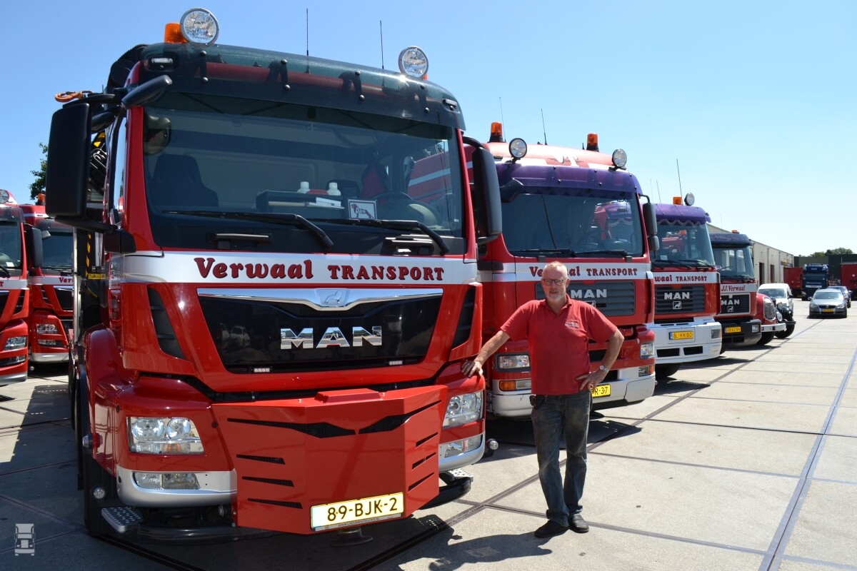 Verwaal Transport uit Stolwijk is al jaren een trouwe MAN klant. Het aandeel MAN is dan ook groot in de vloot van 34 trucks. Onlangs kreeg chauffeur Dirk Boom een nieuwe MAN 8x2-6 met autolaadkraan. Dat bleek de vierde generatie MAN-trucks te zijn die Dirk als vaste truck kreeg. Een moment om even bij stil te staan.