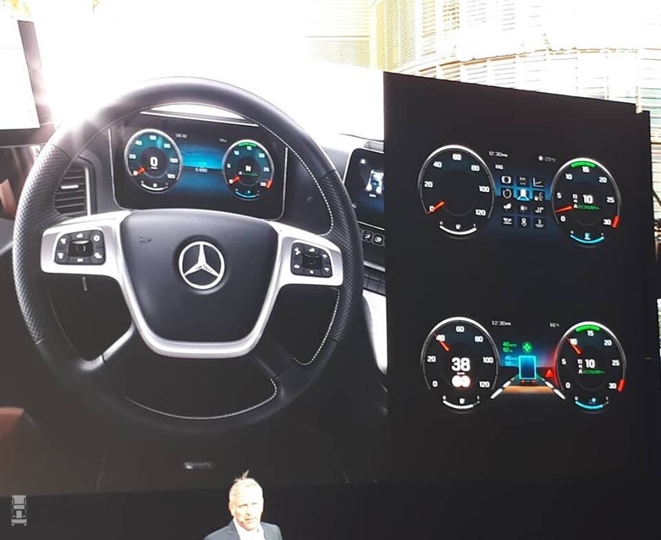 Dat laatste is helemaal nieuw. In niets lijkt het op de ‘oude’ Actros, het gaat nu om twee schermen, eentje recht voor de chauffeur en eentje op de middenconsole. Mercedes-Benz is de eerste truckfabrikant die Active Drive Assist introduceert. Hierbij neemt de Actros op sommige momenten het gezag over van de chauffeur en rijdt de Actros autonoom. Het systeem kan zelfstandig gas geven, remmen en sturen. Mercedes gaf het voorbeeld van harde zijwind. Dan dreigt de truck ietwat van koers te raken, maar met Active Drive Assist corrigeert de truck zichzelf perfect. Mercedes zegt erin te zijn geslaagd de beelden van radar en camera te fuseren waardoor een computer de genoemde beslissingen kan nemen. Dit kan bij alle voertuigsnelheden, aldus Mercedes.