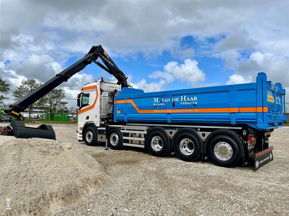 “Eigenlijk zouden wij in eerste instantie de auto met kipper opbouw laten uitvoeren. Maar om aan de vraag van onze opdrachtgevers te voldoen en de auto voor meerdere toepassingen in te kunnen zetten, is gekozen voor een 30 tons kabelafzetsysteem van HTS-NCH in combinatie met een HMF 1943 Z2 kraan met knijper”, aldus chauffeur Bas van de Haar. De keuze voor de 530 pk sterke V8- motor is al even goed uit te leggen. Nu was de tijd. ”De regelgeving en de zero emissie zones zorgen ervoor dat het steeds moeilijker wordt om met dit soort voertuigen in de stad te werken.”