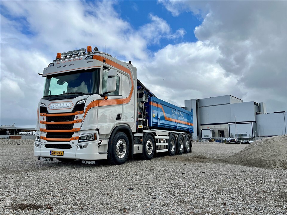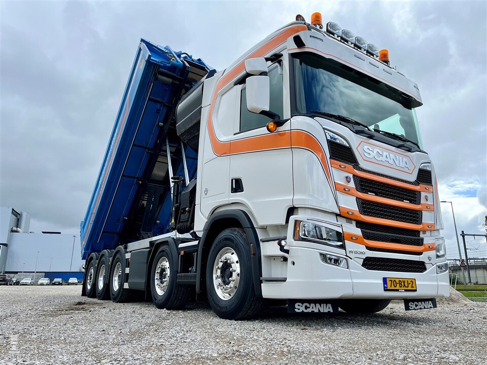 De Scania R530 10x4 met een CR20H cabine en een V8 is een bijzondere verschijning. Hij wordt ingezet voor het vervoer van materiaal voor de wegenbouw, asfalt en gladheidsbestrijding van de snelwegen A9 en A22. Daarom kan de auto worden voorzien van een DIN plaat om de snelwegen sneeuwvrij en begaanbaar te houden. De rondom luchtgeveerde Scania is naast de fraaie lichtmetalen velgen voorzien van extra verlichting, luchthoorns op het dak, zwaailampen en flitsers en een verlengde zonneklep. De Scania spatlappen onder voorbumper maken het plaatje af. De truck werd geleverd door Scania Amsterdam.