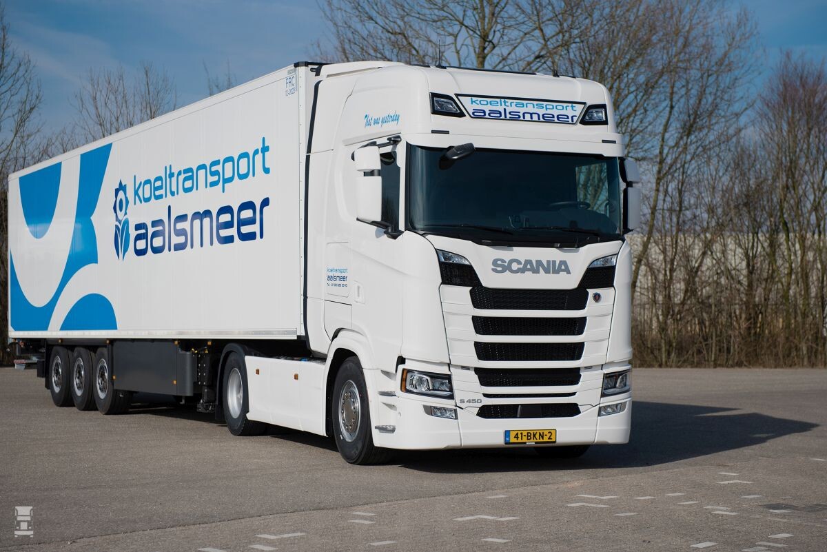 De 15 S450 trekkers zijn de eerste New Generation Scania’s die Koeltransport Aalsmeer koopt. “Ik vind het echt een dijk van een auto met zijn vlakke vloer. En om onze chauffeurs een plezier te doen, hebben we de voertuigen bijna fullspec laten afleveren. Voor de efficiency hebben we de vrijloopretarder als extra optie gekozen. Temeer daar de chauffeur dan ook meteen over ACC beschikt en veilig rijden begint toch met voldoende afstand. Verder hebben we gekozen voor het lederpakket, LED-verlichting, een premium stoel en de premium multimedia installatie met een mooi zeven inch scherm. Als extraatje kozen we voor de nieuwe geïntegreerde standkoeling. En deze auto’s hebben als eerste in onze vloot de nieuwe automatische elektronische handrem. De LED verlichte naamplaat op auto maakt het af.”