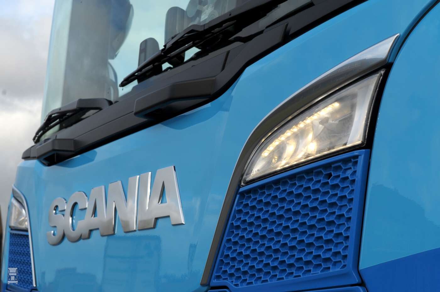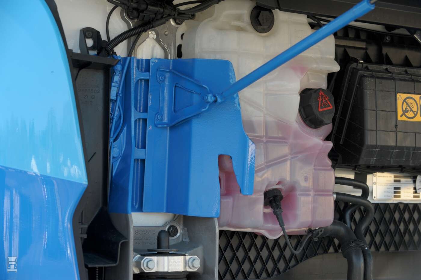 Eén van de dingen die bij de nieuwe generatie vaak vergeten wordt is de inkijk in door de luchtinlaat in de bovengrille. Door dat 'neusgat' kijk je door het rooster zo tegen de blikken voorkant van de cabine aan. Die is vaak wit, en bovendien zitten daar dan glimmende bouten in het zicht. Bij Scania dealer Rinsma hebben ze dat keurig opgelost door daar een stuk plaat te monteren wat keurig in de juiste kleur is gespoten.