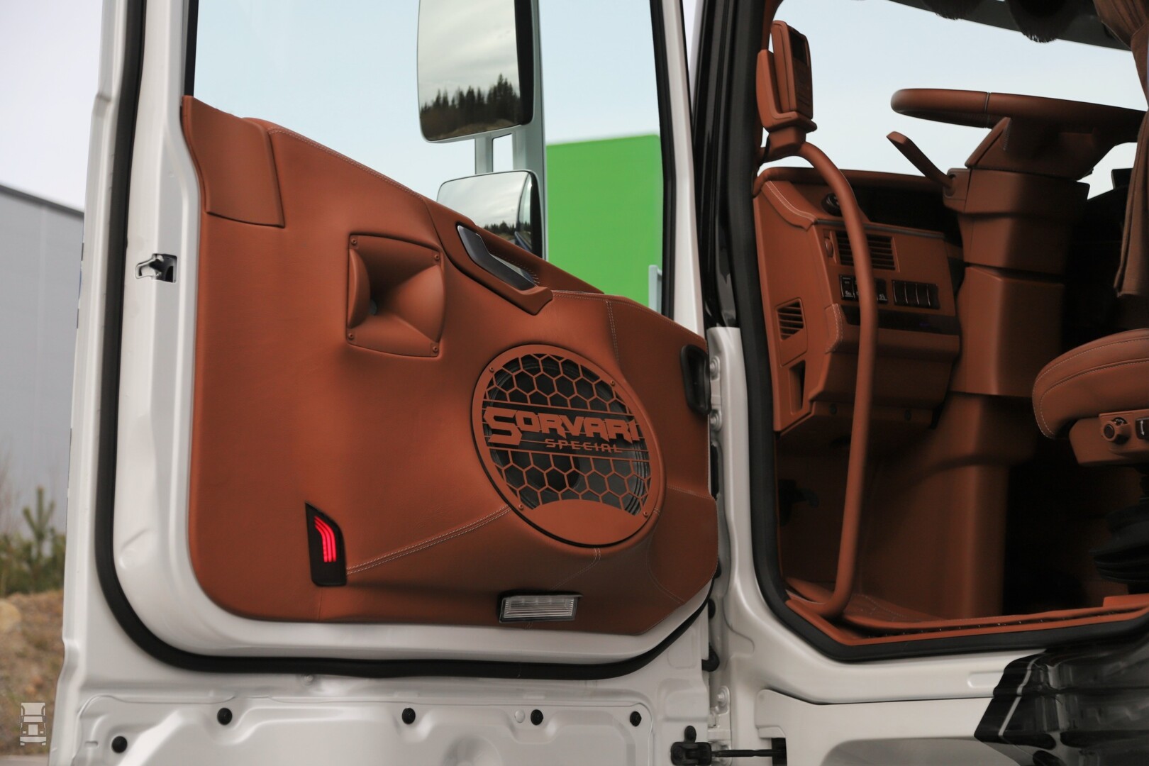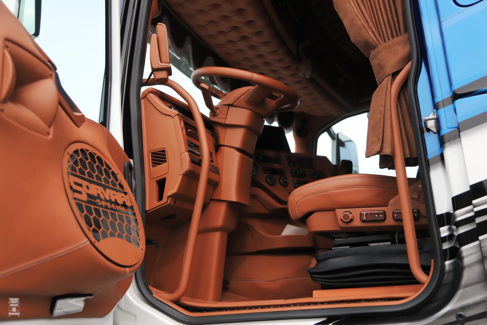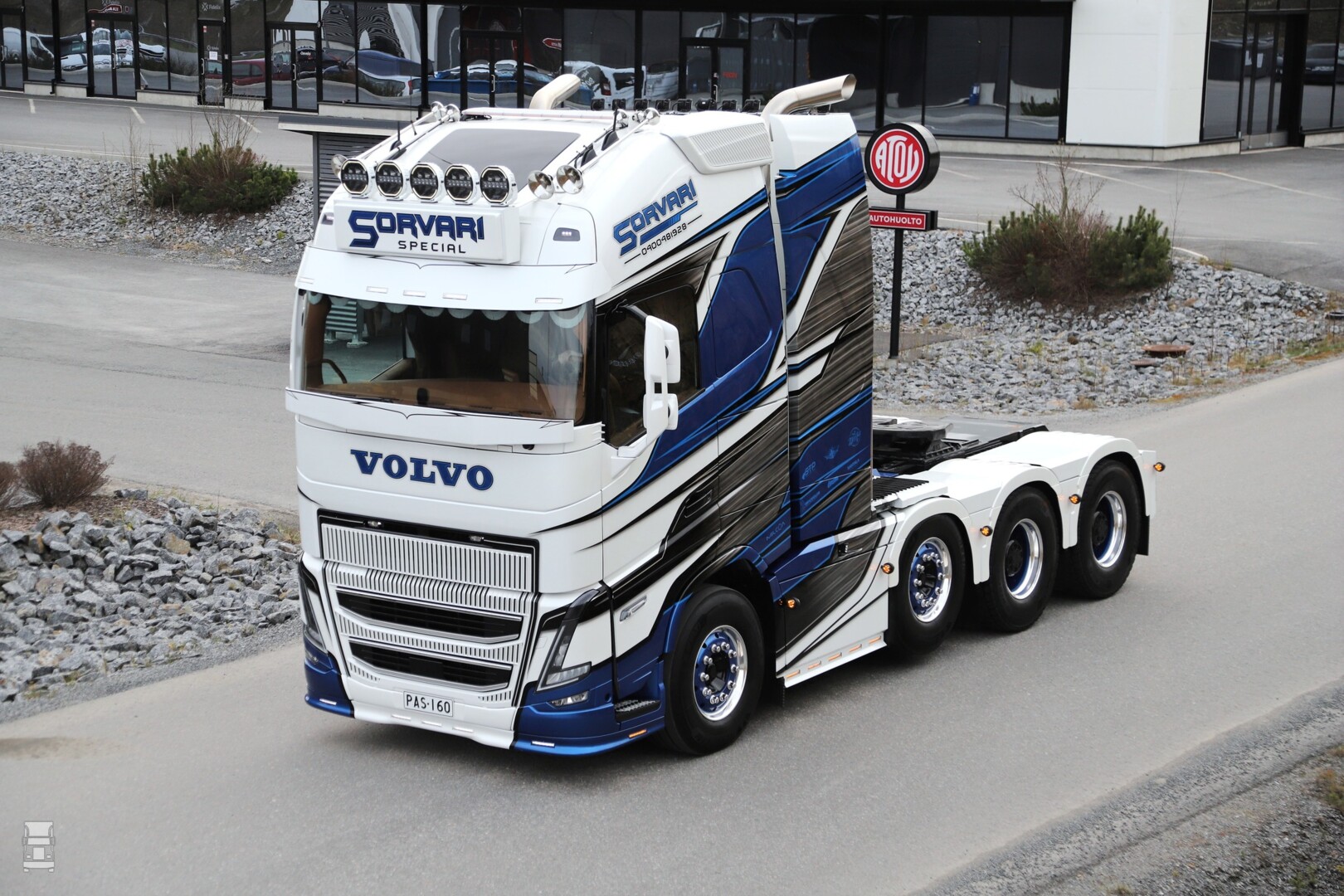 De truck is van Kujetus Pasi Sorvari Oy, een Fins transportbedrijf dat gespecialiseerd is in zwaar transport. De schitterende Volvo FH16 is voorzien van de standaard cabine, en dus niet van het Aero front. Wel zo stoer wat ons betreft. Het lakwerk werd uitgevoerd door Santala Print Oy en het bijzondere interieur werd verzorgd door Golden Beard Customs en JJ Custom. Een opvallend detail wordt gevormd door de luidspreker roosters, met daarin het logo van het bedrijf.