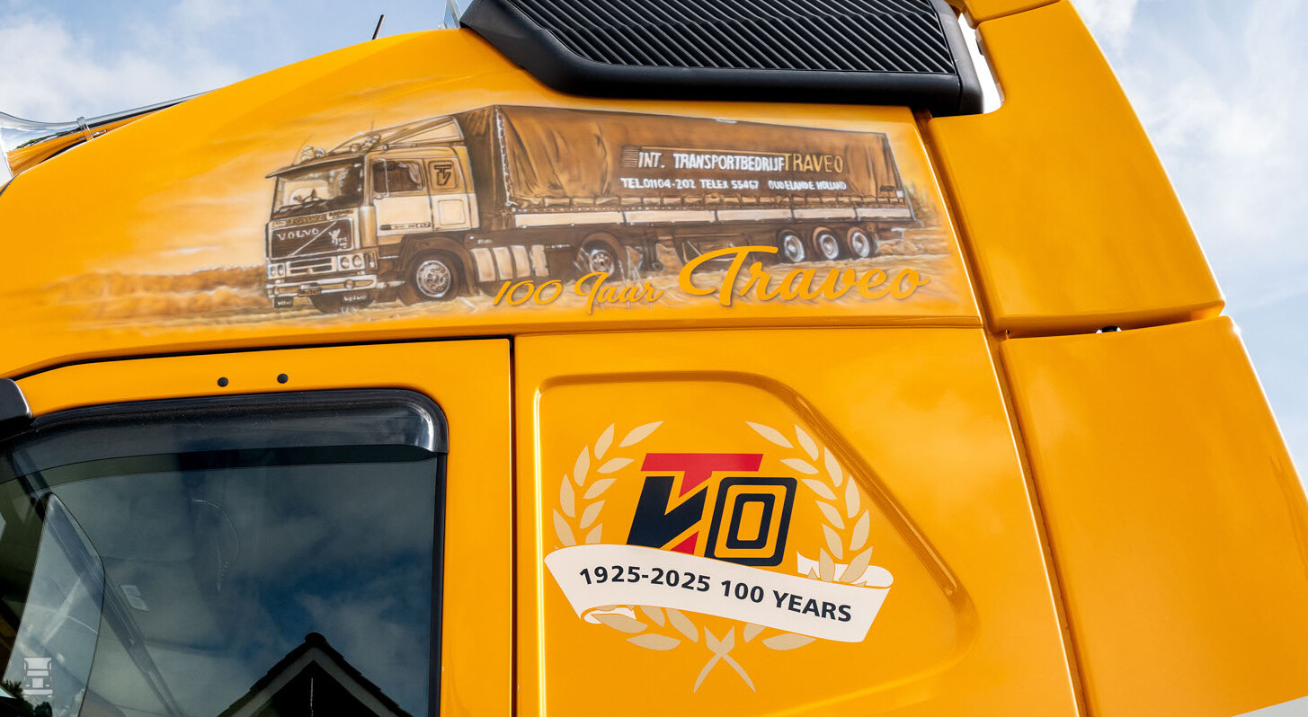 Tijdens het jubileumfeest was er onlangs een onverwachte gast: de nieuwe Volvo FH Aero waarmee Traveo binnenkort gaat rijden. De Volvo FH Aero is voorzien van een special painting op de cabine met een classic Volvo F12 waarmee Traveo in het verleden reed en een logo met de tekst ‘1925-2025 – 100 years’. Dat was een goed bewaard geheim: zelfs de familie wist niet hoe de Volvo FH Aero eruit zou zien. Femke van ’t Veer: “Binnenkort wordt de truck echt geleverd dus het was een grote verrassing dat deze truck er bij het jubileum was. Nog verrassender was het speciale spuitwerk. Mijn man, die ook in ons bedrijf werkt, had dit in het diepste geheim samen met Bluekens Truck en Bus geregeld. Mijn broer en ik wisten van niets. Het was echt een verrassing, en het maakte de viering van het jubileum extra bijzonder.” De truck is door de spuiterij van Bluekens Truck en Bus in Goes in de huisstijl van Traveo gespoten. R-BRUSH heeft het speciale spuitwerk van de Volvo F12 gedaan.
