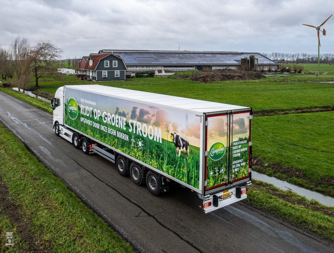 De koelmachine op de oplegger kent een volledig elektrische aandrijving, waarbij de krachtstroom wordt geleverd vanuit de trekker. De trekker is hiervoor af-fabriek uitgerust met een elektrische Power Take-Off (e-PTO). Dit systeem zorgt voor een aftakking van de hoog voltage accuspanning en zet deze vervolgens om in krachtstroom waar de koelmachine op werkt. De voordelen van deze constructie ten opzichte van e-assen en accupakketten op de trailer, zijn duidelijk: minder complexiteit dus meer bedrijfszekerheid, minder eigen gewicht dus hogere efficiëntie en een lagere investering. Royal Friesland Campina heeft op haar locatie in Maasdam een ABB-snellaadpaal laten installeren, waar deze nieuwe elektrische truck de maximale laadsnelheid van 250 kW kan benutten. Met oog op een slagvaardig beheer van de laadsessies, heeft Royal Friesland Campina werkafspraken gemaakt met de planning van Simon Loos, installatiebedrijf Batenburg en de Volvo Trucks-dealer in Rotterdam.
