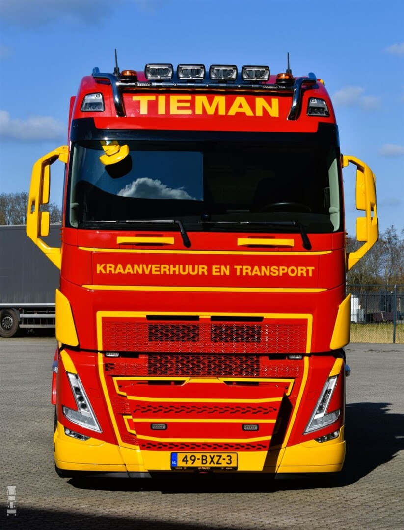 Het voertuig waar de kraan op staat is ook niet mis. De Volvo FH 8x2 is zowel een trekker als bakwagen. Zowel als bakwagen en als trekker beschikt hij over een vangmuil. Als trekker heeft hij bovendien een afneembare schuifschotel. Voor de cabine is een steunpoot gebouwd. De Volvo, die is opgebouwd door De Jong IJmuiden en Elcar BV, staat in de opvallend kleuren van Tieman Kraanverhuur. Hiermee kan deze Volvo voor de dag komen!