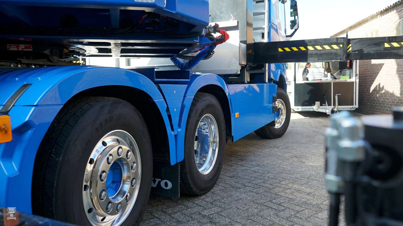De nieuwste investering betreft een 500 pk sterke Volvo FH 6x2 trekker met een 54-tonmeter HIAB autolaadkraan met jib en lier. Met een mastlengte van 35 meter in combinatie met de lier is dit echt een uitkomst volgens Johan. “Het geeft ons veel tijdwinst, doordat we met masten plaatsen niet steeds hoeven in en uit te schuiven.” De truck is voorzien van een naloopas, om er ook in krappe woonwijken mee uit de voeten te kunnen. Met de schotel ver naar achteren komt de nieuwe twee-assige Broshuis bijna niet binnendoor. Tevens is deze vanuit de cabine draadloos bestuurbaar. Het hele setje is 17,5 meter lang, uitgeschoven kan de combinatie 23,5 meter worden.